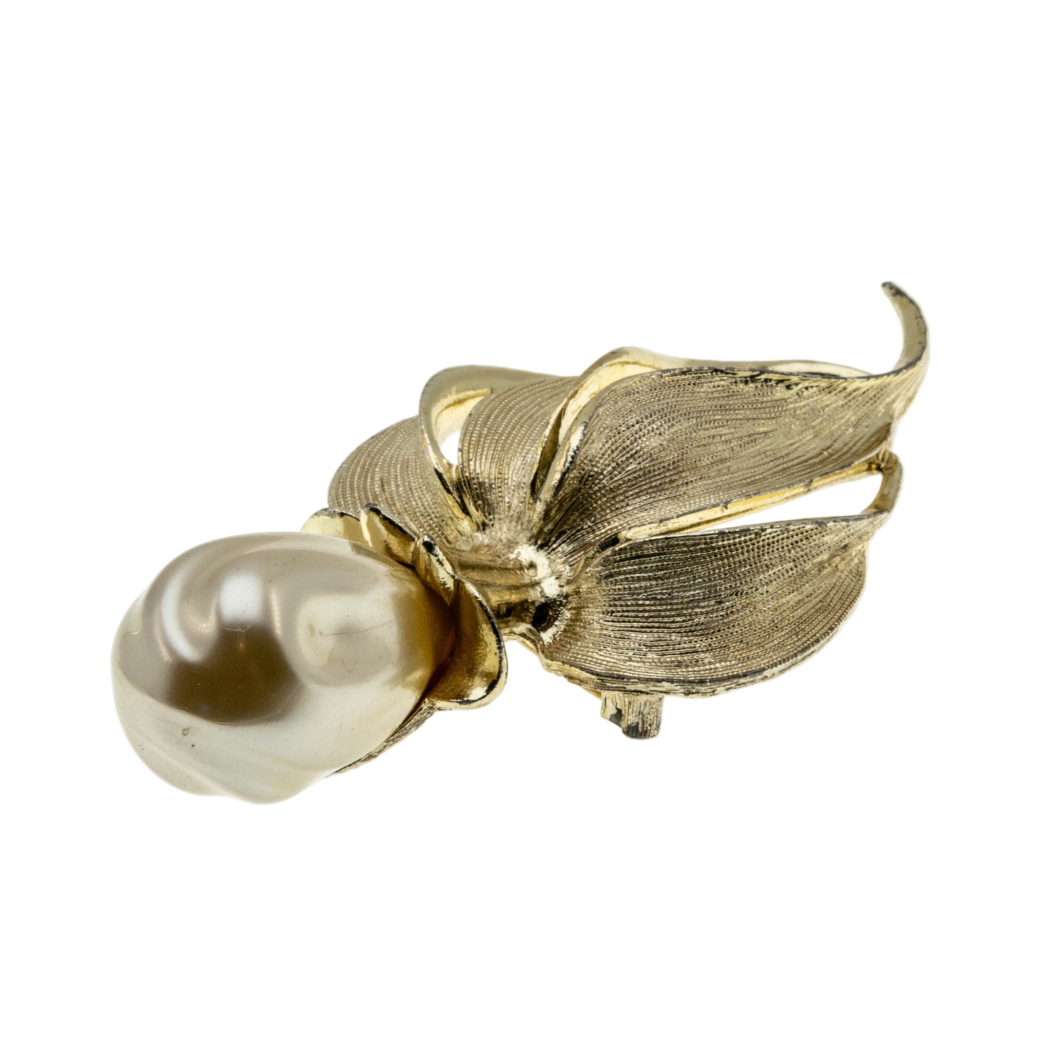 Elegant Flower - Vintage Signed 'Sarah Coventry' Gold Plate Baroque Pearl Brooch. This gorgeous brooch is crafted from gold plate over a base metal. Featuring one simulated baroque pearl, Vintage styling, and quality craftsmanship. This exquisite brooch is made in the form of a of a flower, comprised of exquisite defined layers of gold, and a sculpted leaves. The flower is adorned with a beautiful champagne coloured lustrous pearl. The brooch features a pin and rotary lock, which is in perfect working order. This highly collectible Vintage designer brooch looks stunning on a coat, or jacket. So elegant and classy!