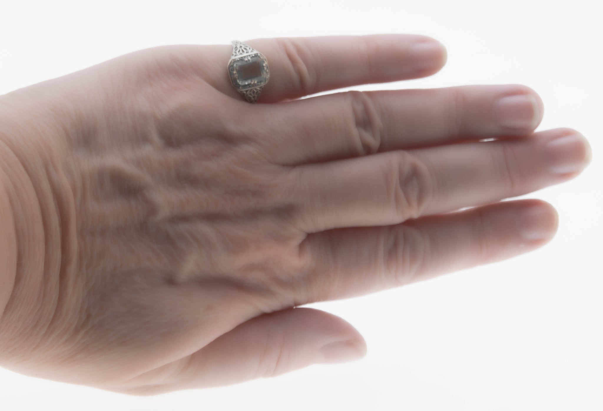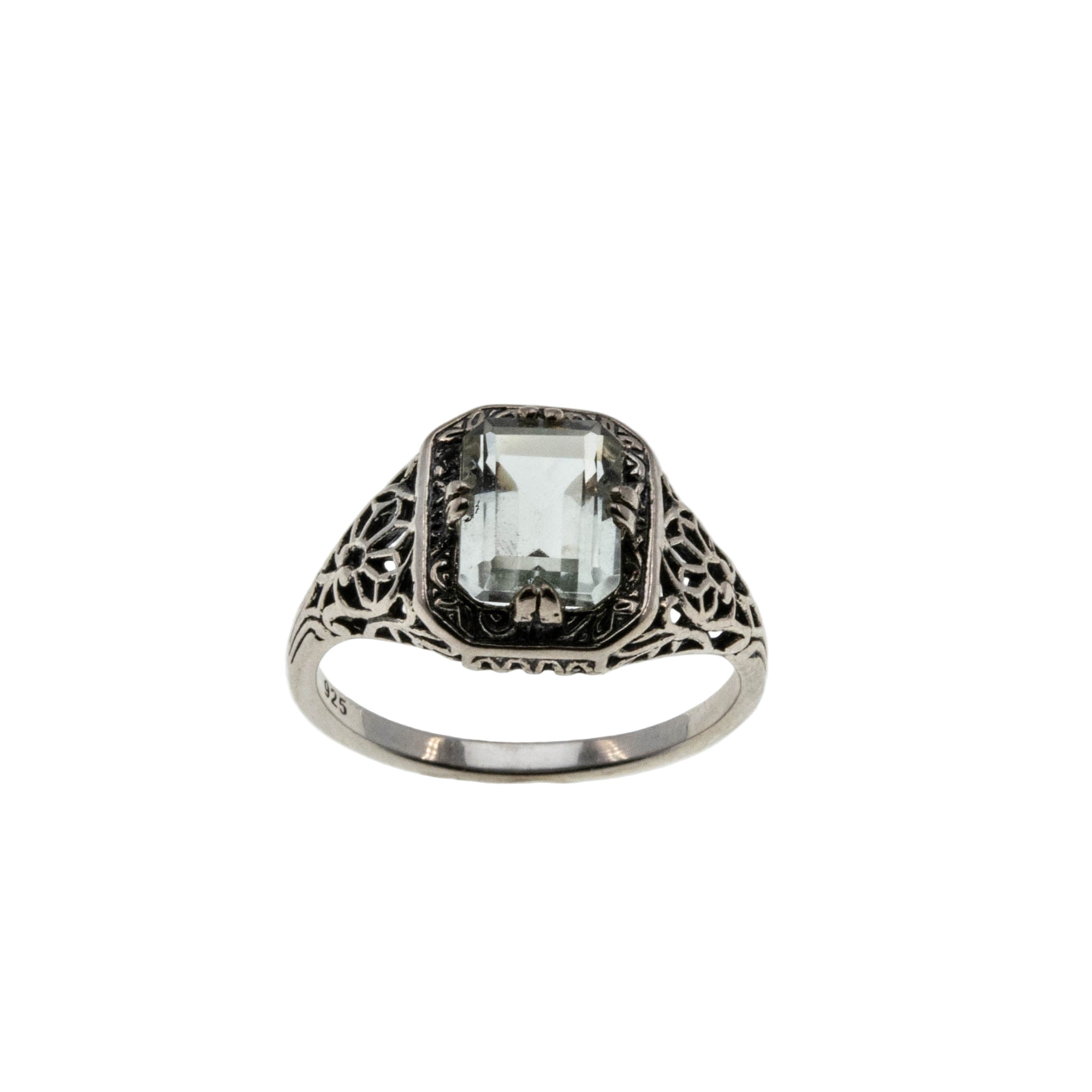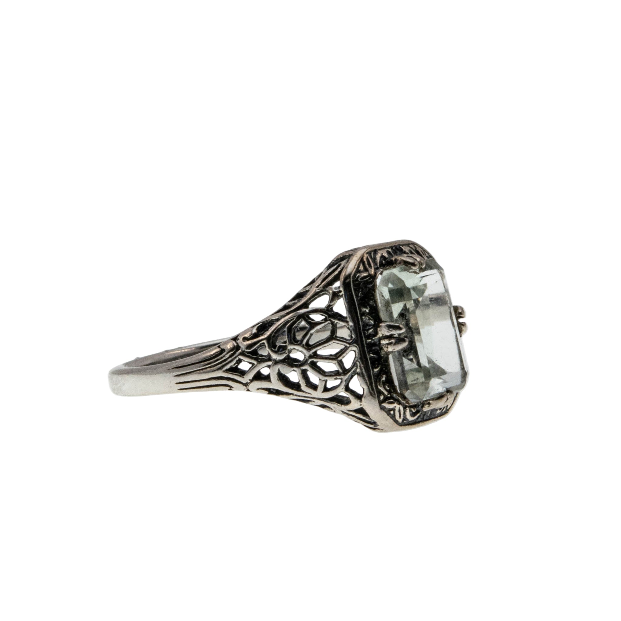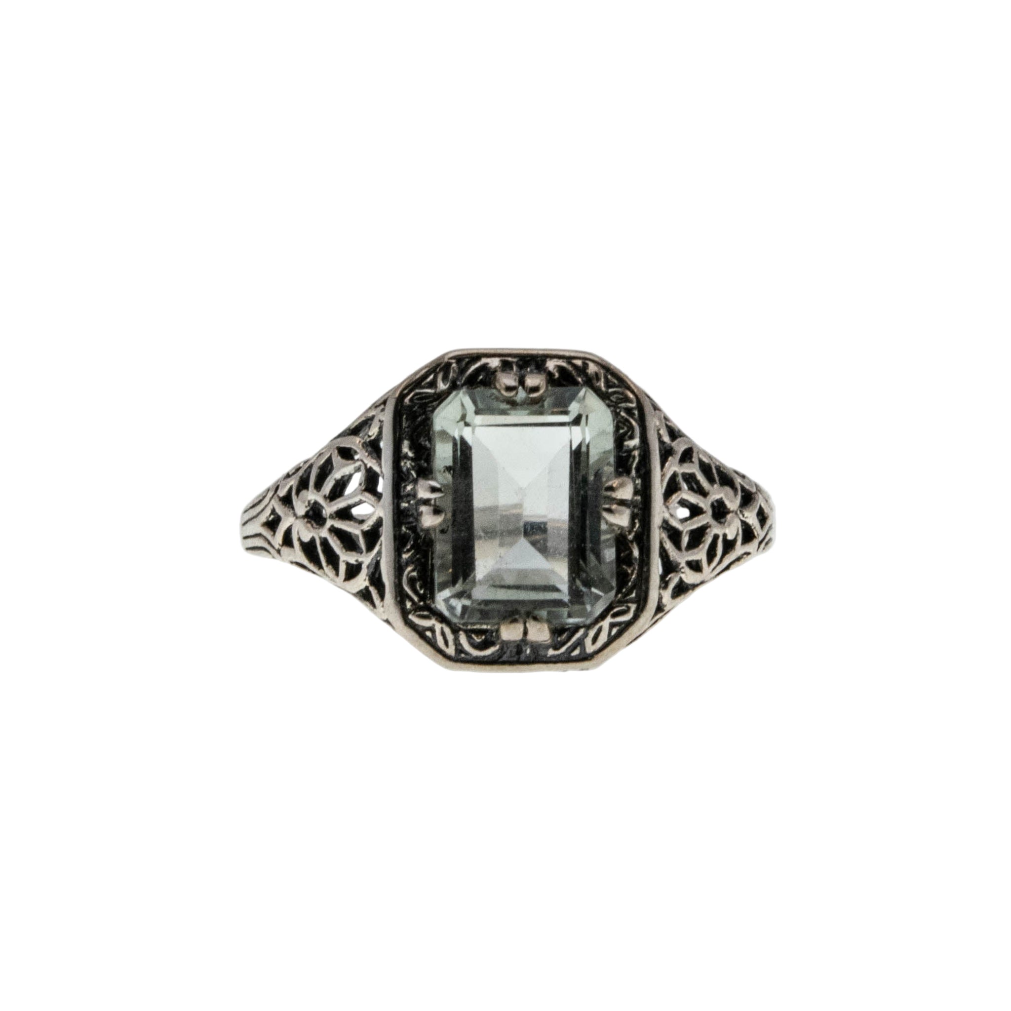Elusive Dream - Estate Sterling Silver Natural Green Amethyst Filigree Ring. This beautiful estate ring is made of sterling silver, hallmarked 925, for sterling silver. Featuring one natural emerald cut green amethyst, Edwardian Revival styling, and quality craftsmanship. The expertly claw-set green amethyst showcases a beautiful pale shade of green. The silver work on this ring is lovely and delicate however it is still substantial. Beautifully detailed, displaying detailed scrolls, filigree work, and engravings, which extends down the shoulders of the ring. The shank is polished, and smooth, which allows for a comfortable fit, and easy sizing. This estate ring is in remarkable condition with an Edwardian feel. It would make a perfect gift or wonderful addition to any jewellery collection.
