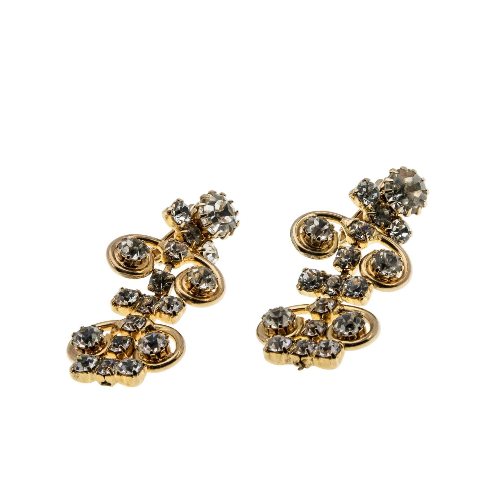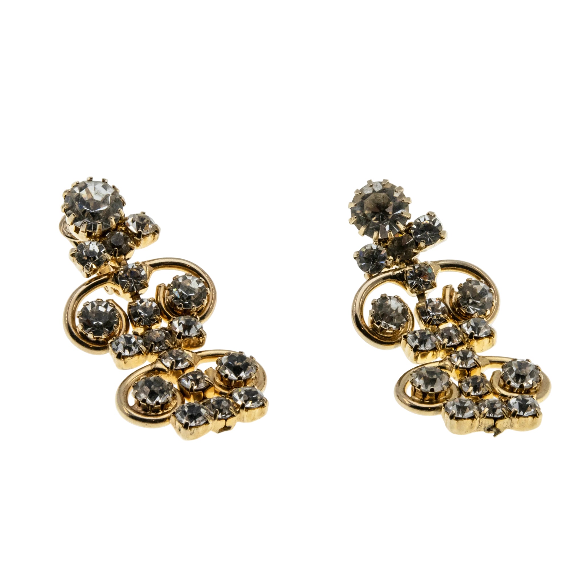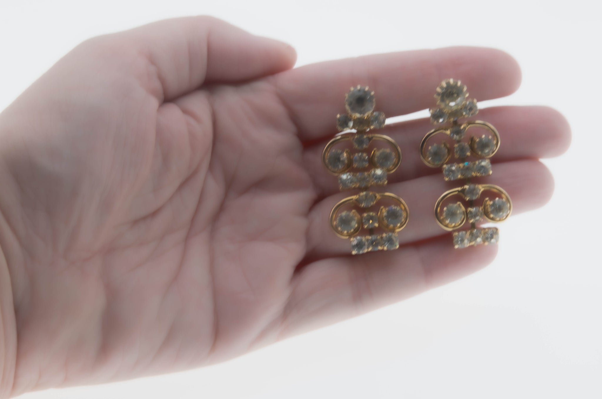 Girls Night Out - Vintage Signed Sarah Coventry Gold Plated Crystal Rhinestone Clip-On Earrings. These wonderful earrings are crafted from Gold Plate over metal, hallmarked Sarah Cov. The earrings feature numerous round cut crystal rhinestones, vintage era styling, and quality craftsmanship. These elegant earrings are comprised of beautiful sparkling clear crystals, which are expertly hand-set into individual claw-set settings. The frame of the earrings are made up of gentle curves, and segments, which are articulated in such a way that the earrings have nice movement. The earrings are for pierced and non pierced ears, featuring the original signed clip-on backings. These vintage earrings would make a great choice for any special occasion, or a wonderful addition to any vintage Jewelry collection.