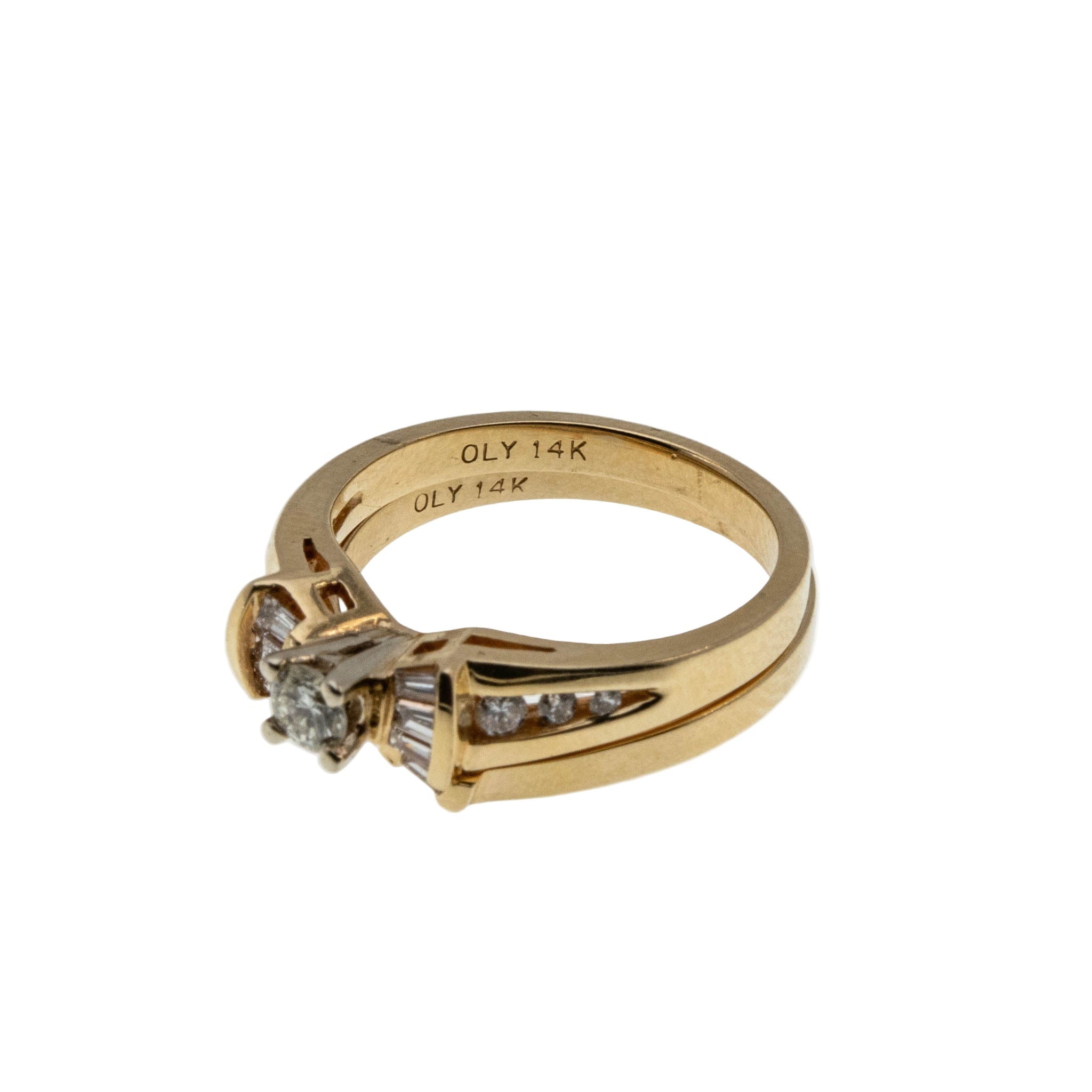 Glittering Bow - Vintage 14K Gold Natural Diamond Wedding Ring Set. This gorgeous set is crafted from 14K yellow gold, hallmarked 14K, and signed OLY. This set features one natural round brilliant diamond (centre), 8 natural tapered baguette diamonds, 6 natural round brilliant diamonds, vintage era styling, and quality craftsmanship. This charming set is comprised of an engagement ring, which is expertly claw-set with one beautiful sparkling centre diamond, and adorned by glittering baguette diamonds, which is created in the form a bow. The shoulders of the engagement ring are expertly channel-set with graduated sparkling diamonds. The matching wedding ring fits perfectly with the engagement ring, and is enhanced by sparkling baguette diamonds. The ring set displays a beautiful buttery gold colour, and a high polished finish. The set features a smooth, and polished shank, which allows for easy sizing, and a comfortable fit. This beautiful vintage era set is low profile, which is perfect for daily wear. Truly a wonderful unique wedding set for that special someone to be cherished and enjoyed for a lifetime.