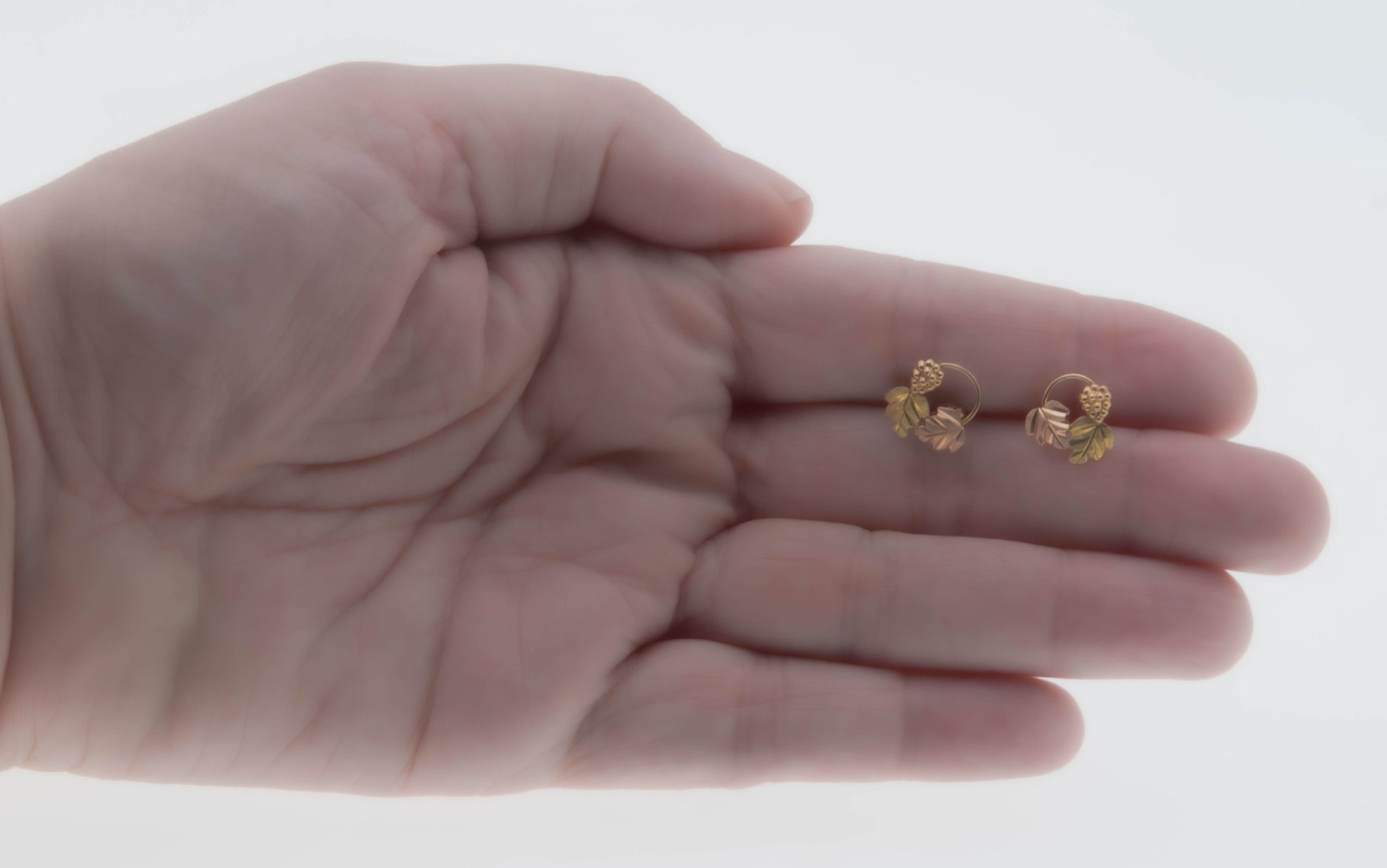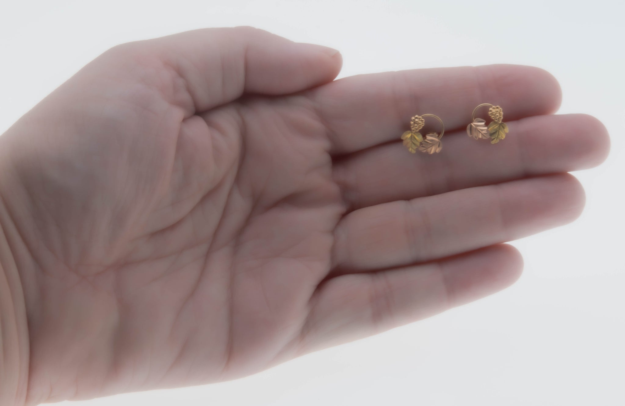 Grapes & Vines - Vintage Signed 'Coleman Co.' 10K/14K Black Hills Rose & Yellow Gold Stud Earrings. These lovely earrings are crafted from 10K yellow and rose gold, hallmarked 10K and a makers mark CCO. The posts of the earrings are crafted from 14K, hallmarked 14K. Whilst the butterfly backs are crafted from 10K yellow gold, hallmarked 10K. The earrings feature authentic Black Hills Gold, vintage styling, and quality craftsmanship. The earrings are comprised of vine leafs and grapes (a characteristic of Black Hills Gold), They are for pierced ears, featuring 14K gold posts and secure butterfly backings. These unique earrings would make a lovely gift or addition to any vintage jewelry collection.