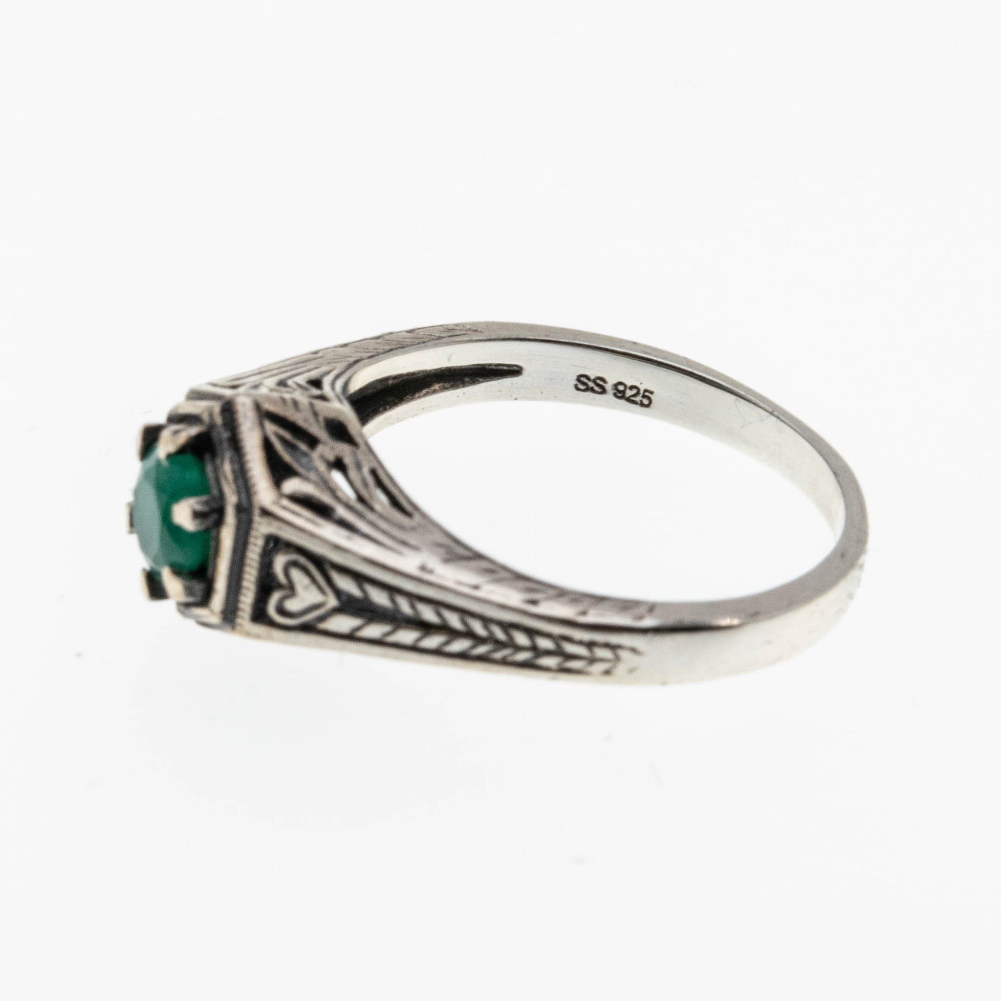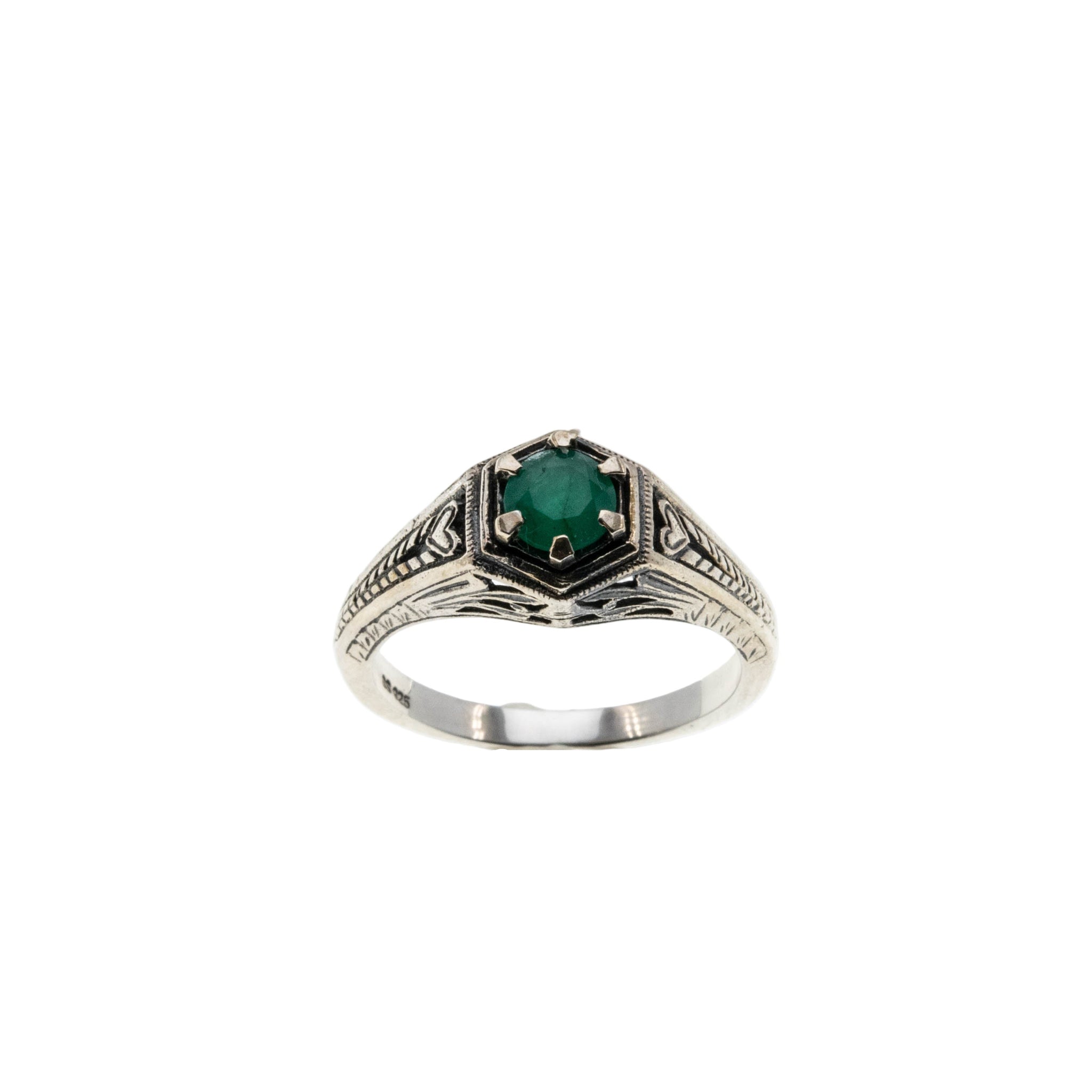 May Birthstone & Hearts - Estate Sterling Silver Natural Emerald Engraved Filigree Ring. This pretty ring is crafted from sterling silver, hallmarked 925. The ring features one natural round cut faceted emerald, Edwardian Revival styling, and quality craftsmanship. The setting on this ring is hexagon shaped, and expertly claw-set with a beautiful green emerald. The gallery exhibits lovely filigree work, and engravings, which add character and detail to the piece. The shank is smooth, and polished, which allows for a comfortable fit and easy sizing. This estate ring would make a wonderful gift or addition to any jewelry collection.