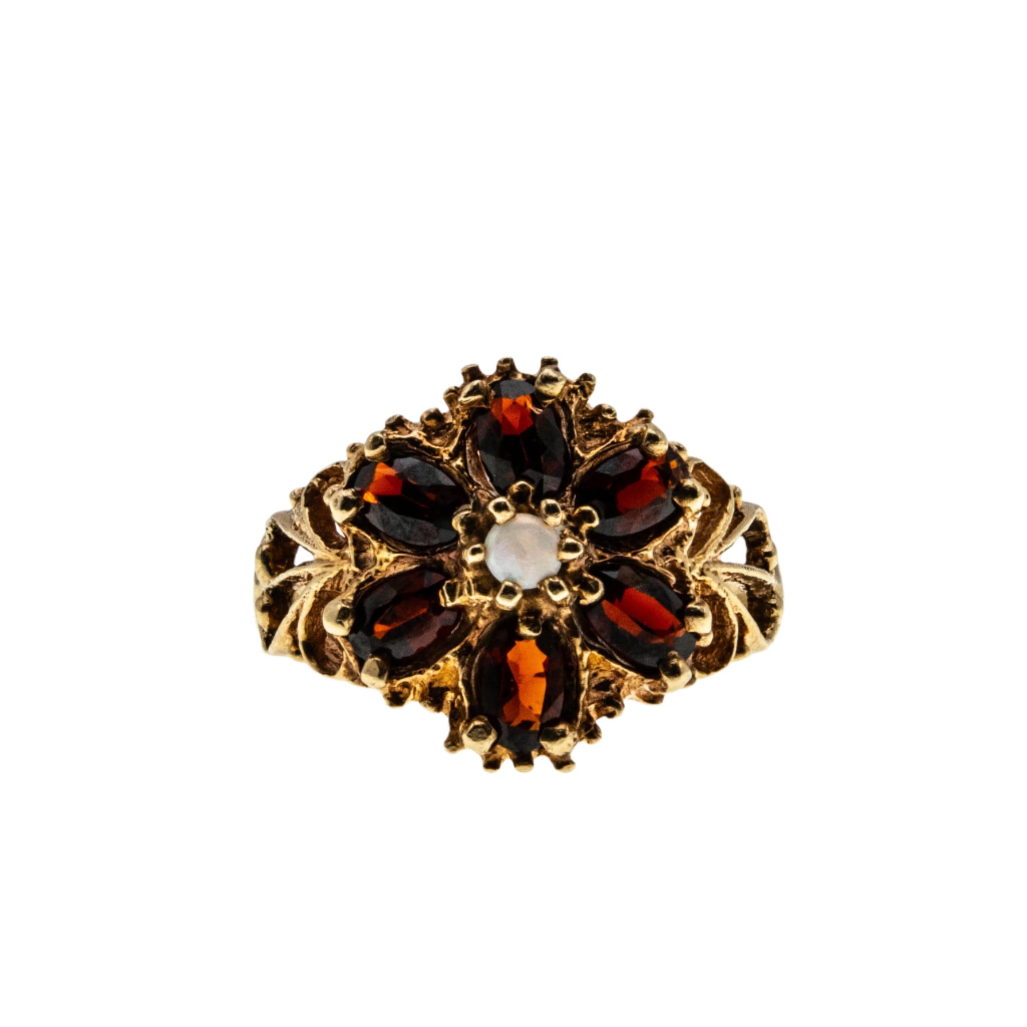 Jewelled Flower - Vintage 10K Gold Natural Garnet & Opal Flower Cluster Ring. This gorgeous ring is crafted from 10K gold, hallmarked 10K, and a makers mark TJE. The ring features 6 natural oval cut faceted garnets, one natural round cabochon opal, vintage styling, and quality craftsmanship. This wonderful ring is made in the form of a flower, which is comprised of a white opal in the centre, and rich deep red wine garnets, which make-up the petals of the flower. The shoulders of the ring exhibit lovely scroll-type open-work, which leads down to a polished and smooth shank. The band allows for a comfortable fit and easy sizing. This beautiful vintage ring would make a perfect gift or addition to any vintage jewelry collection.