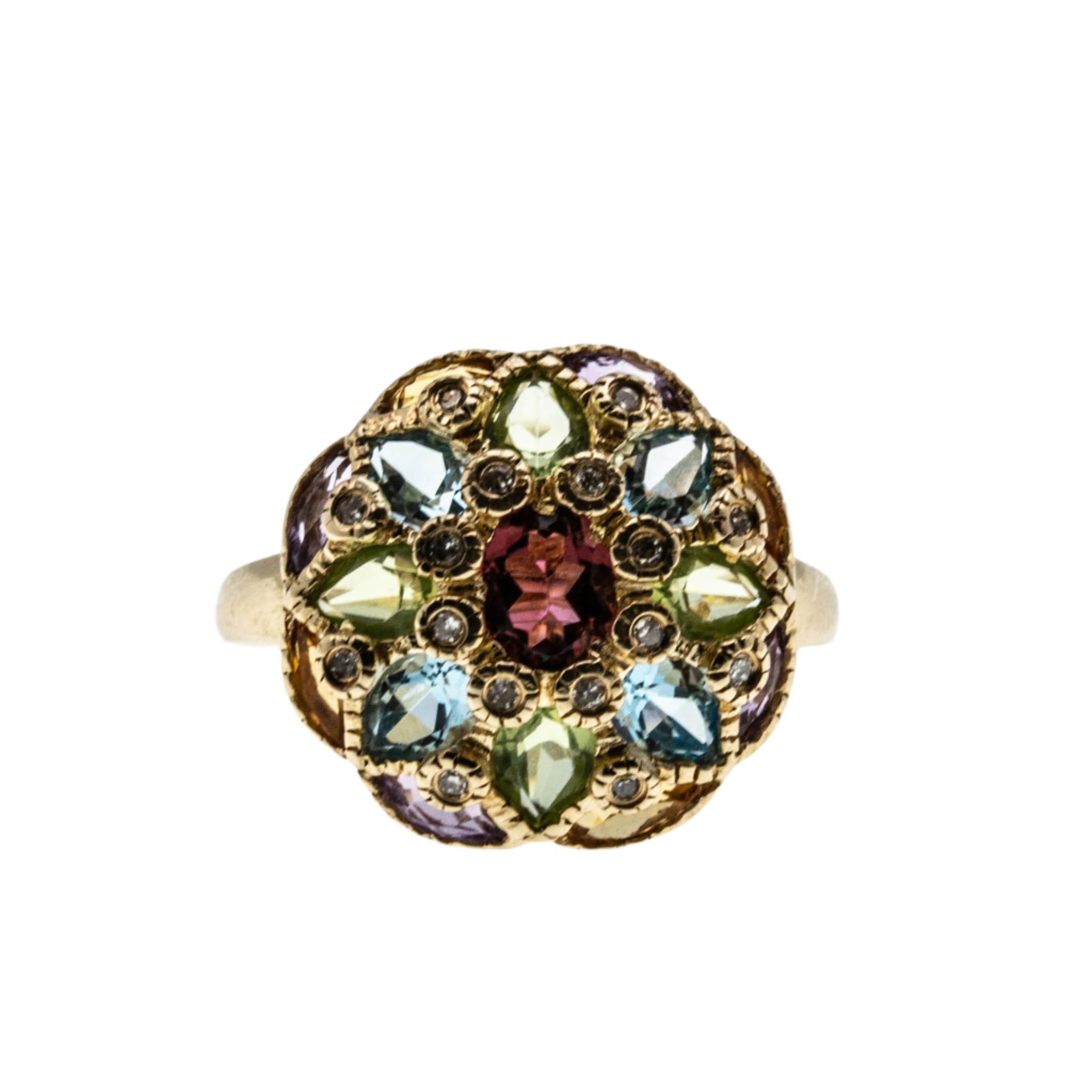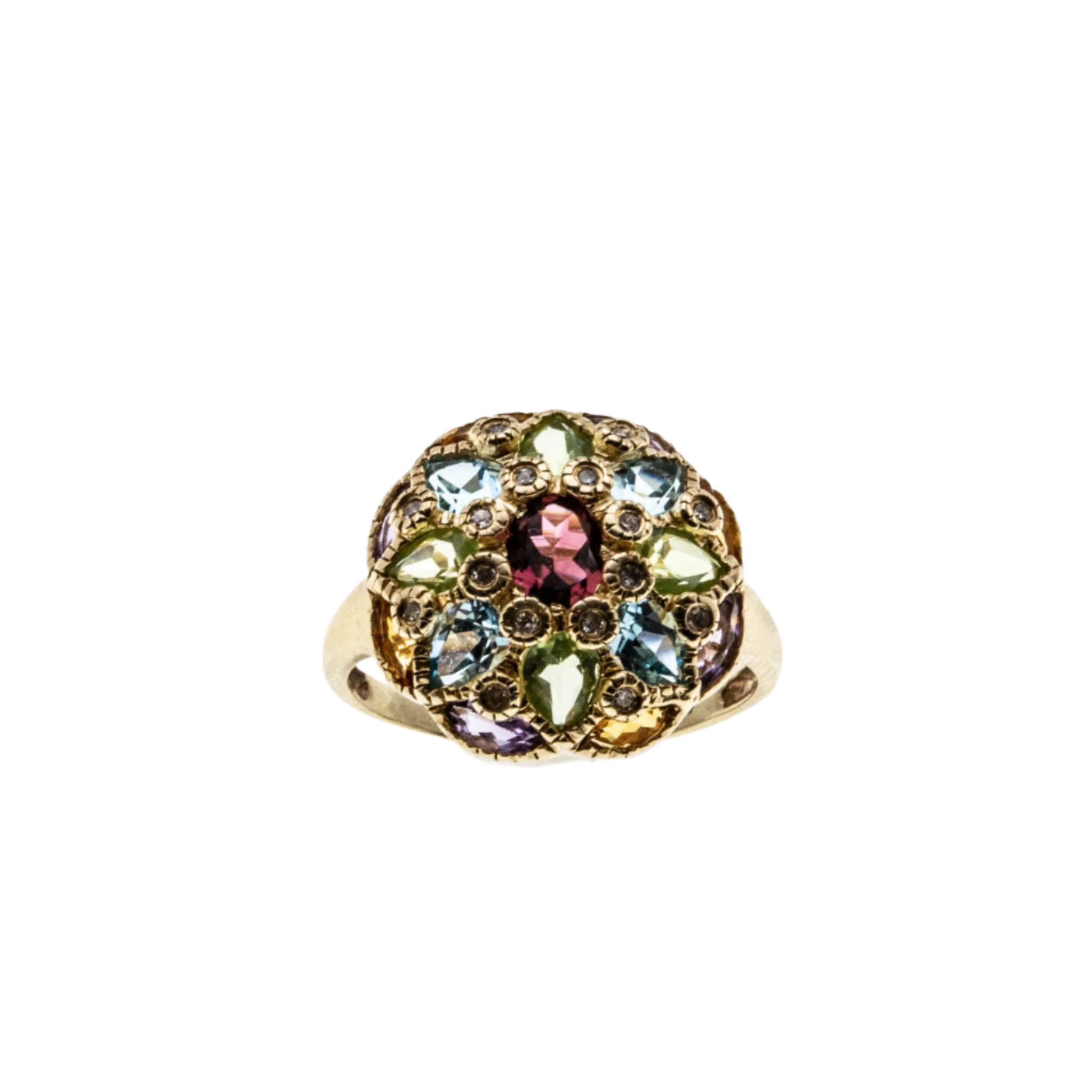 Kaleidoscope - Vintage 14K Gold Natural Multi-Stone Dome Cluster Ring. This unique ring is crafted from 14K yellow gold, hallmarked 14K, tested , and confirmed. The ring features 4 natural marquise shaped citrines, 4 natural marquise shaped amethyst, 4 natural pear shaped peridot, 4 natural pear shaped blue topaz, one oval cut pink tourmaline, 16 natural round cut diamonds, vintage era styling, and quality craftsmanship. The gallery on this ring is shaped as a dome, and adorned by an array of colourful gemstones, which are interspaced by diamonds. The gallery also features wonderful milgrain decoration around each bezel, adding character and detail to the beautiful ring. The band is polished and smooth, which allows for a comfortable fit and easy sizing. This vintage beauty looks stunning when worn, truly a wonderful addition to any fine jewelry collection: