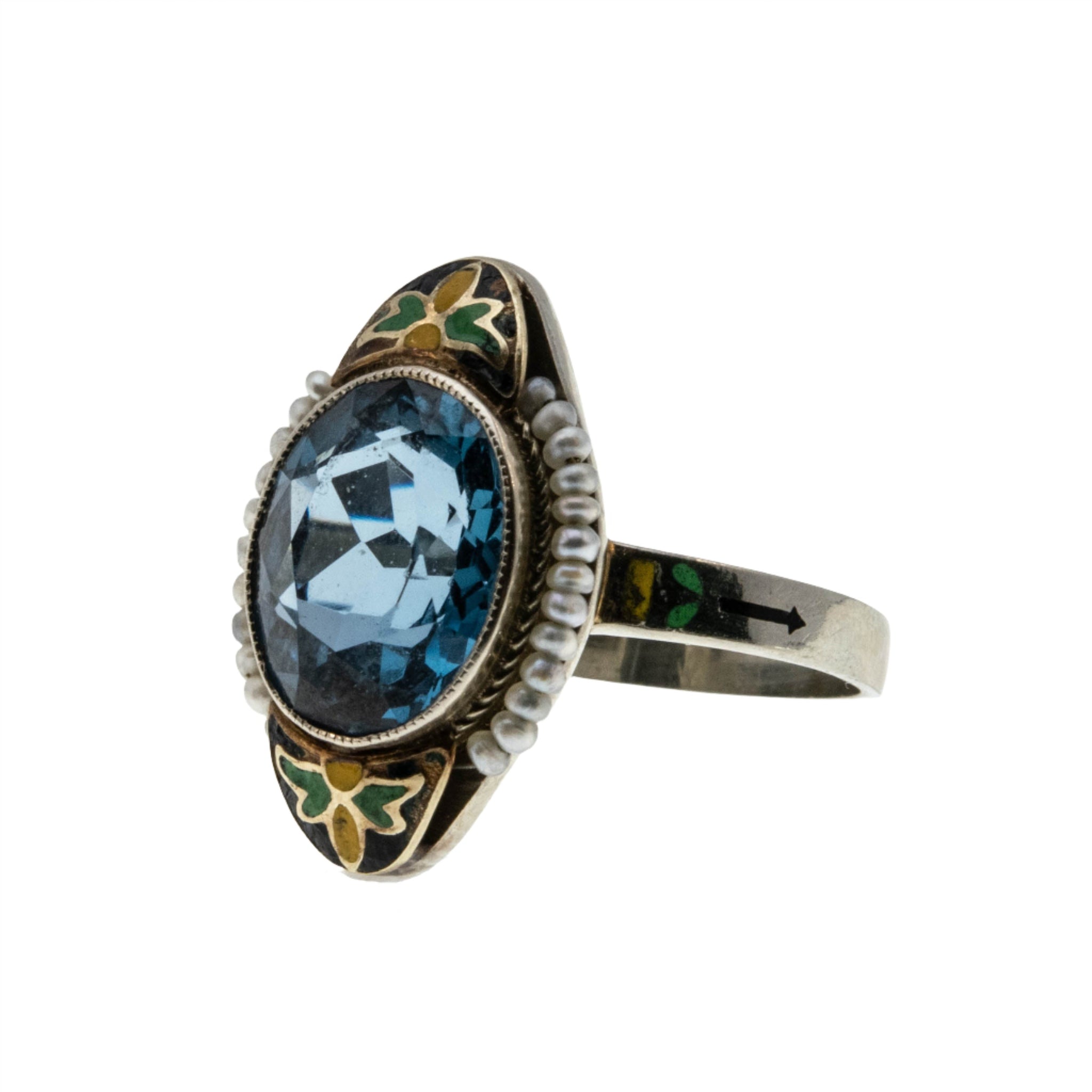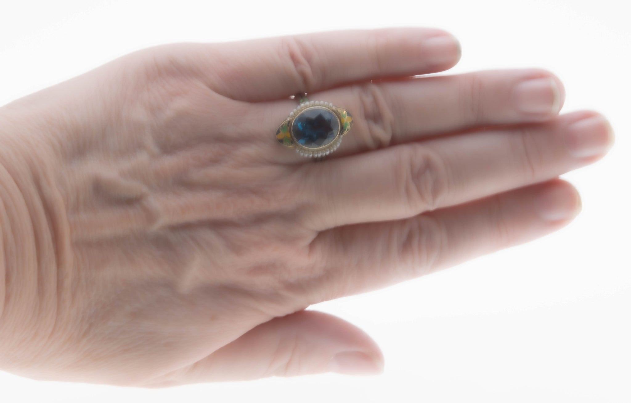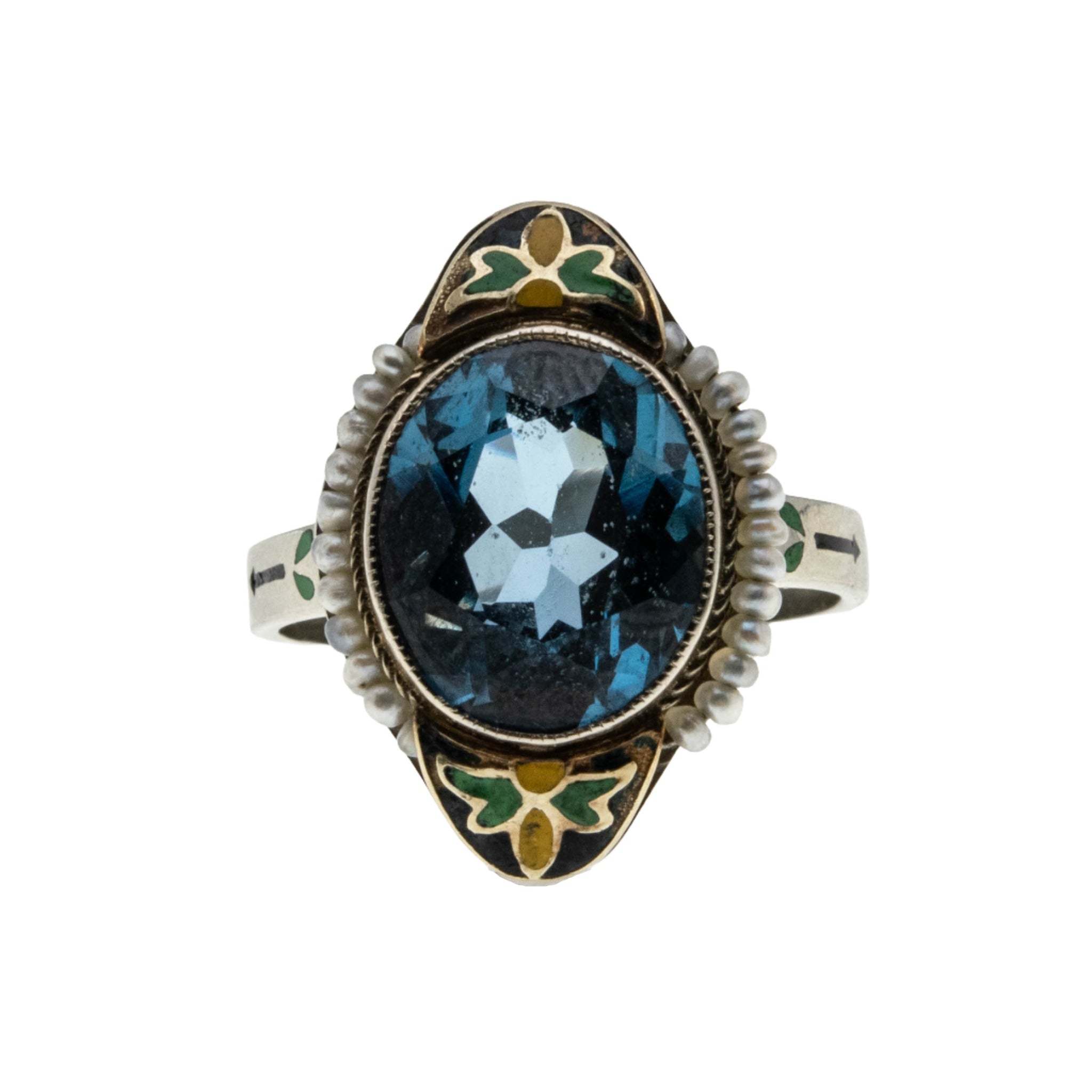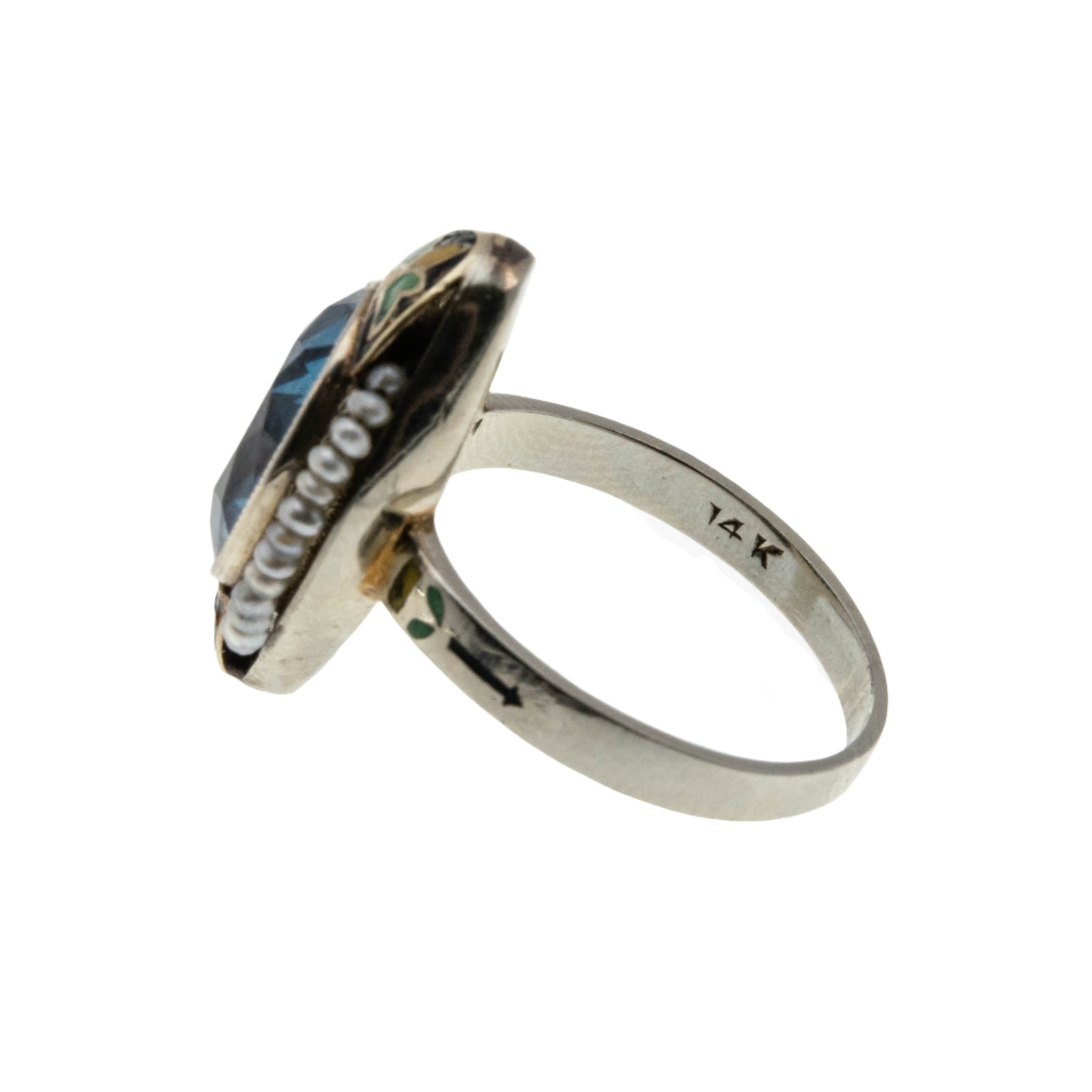 Mediterranean Blue - Art Deco 14K White & Yellow Gold Blue Spinel & Natural Seed Pearl Enamel Ring. This rare ring is crafted from 14K white and yellow gold, hallmarked 14K. The ring features one oval faceted cut synthetic blue spinel, 24 natural seed pearls, Art Deco era styling, and high quality craftsmanship. This amazing ring is expertly set with a beautiful blue spinel, framed by a lustrous pearl surround and exquisite enamel work. The pearls are handed-wired on gold (a characteristic often seen in ancient jewelry dating back to thousands of years ago) displaying a beautiful white/silvery color. The gallery is also comprised of a lovely yellow gold twisted rope design, and, a milgrain decorated bezel. The ring also exhibits fantastic enameled shoulders, whilst the shank is smooth and polished, which allows for a comfortable fit and easy sizing. This superb Art Deco era ring is a very rare example in very fine condition.