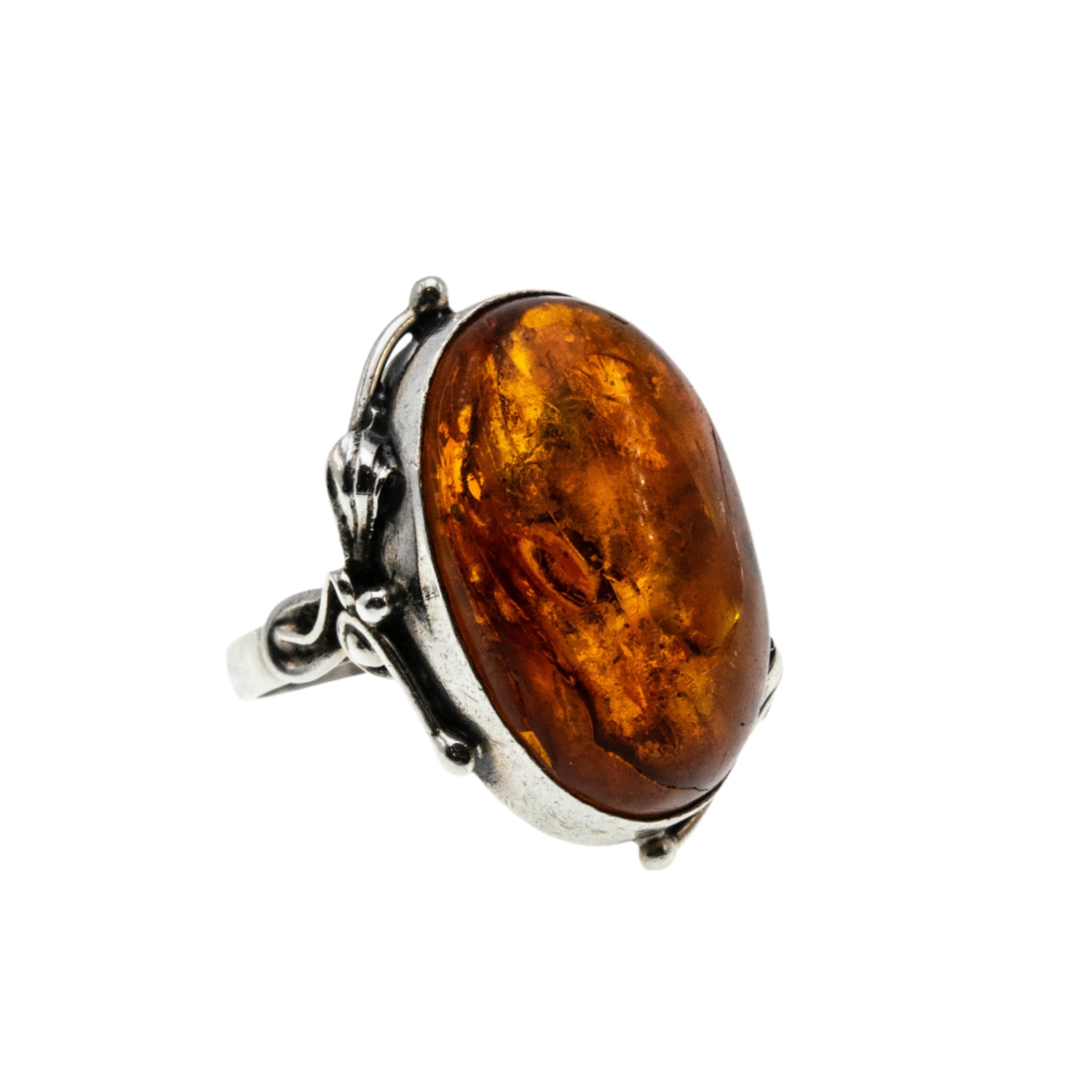 Nature's Honey - Vintage Sterling Silver Natural Baltic Amber Foliage Ring. This gorgeous ring is crafted from 925 sterling silver, tested. Featuring a natural Baltic amber gem, vintage styling, and quality craftsmanship. The expertly set amber has a lovely cognac colour, which exhibits very interesting natural specimens throughout the amber. The setting is very attractive, featuring foliage and scroll-type detail. The shank is smooth and polished, which allows for a comfortable fit , and easy sizing. This vintage statement ring would make a perfect gift, or wonderful addition to any jewelry collection.