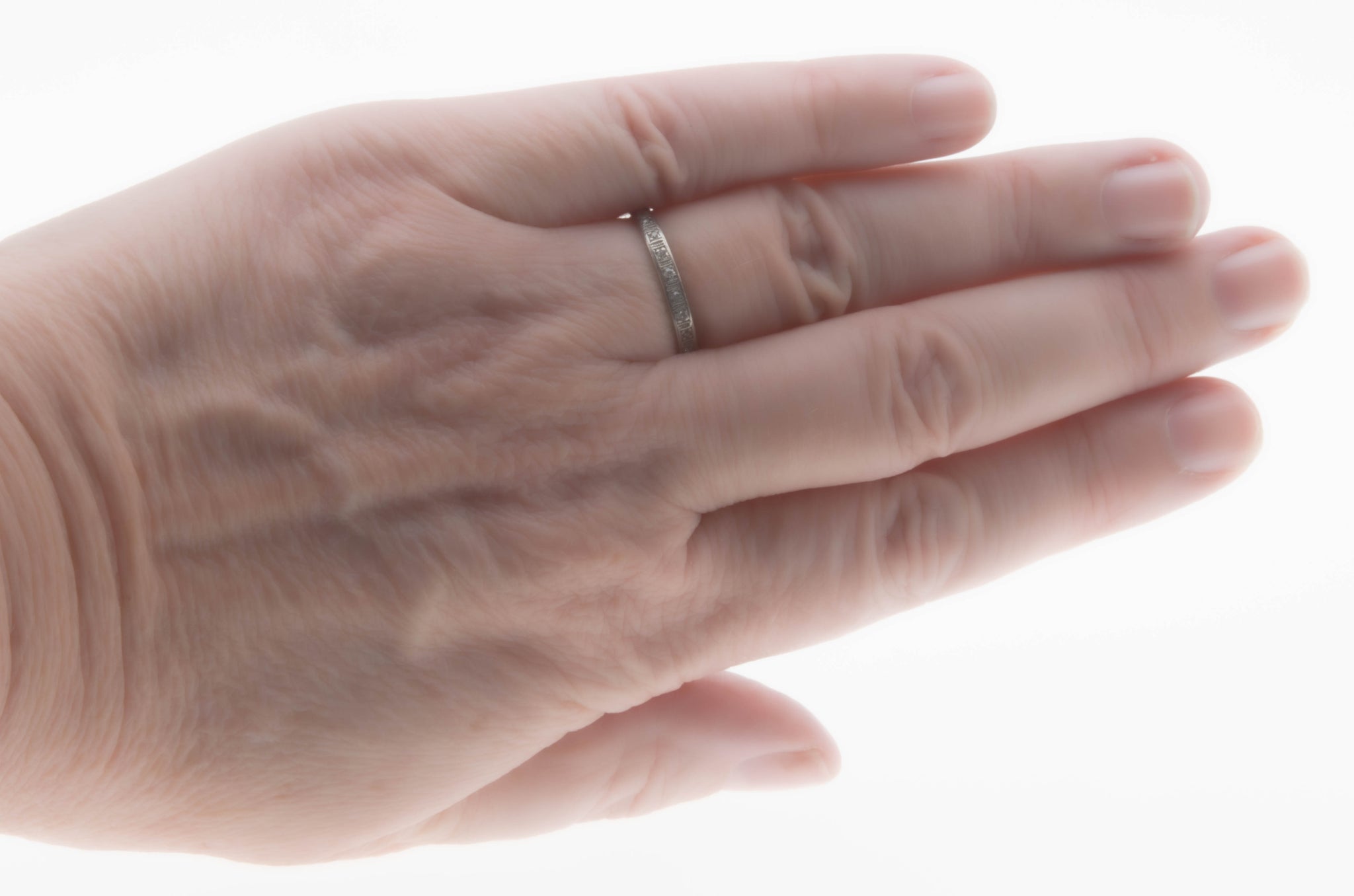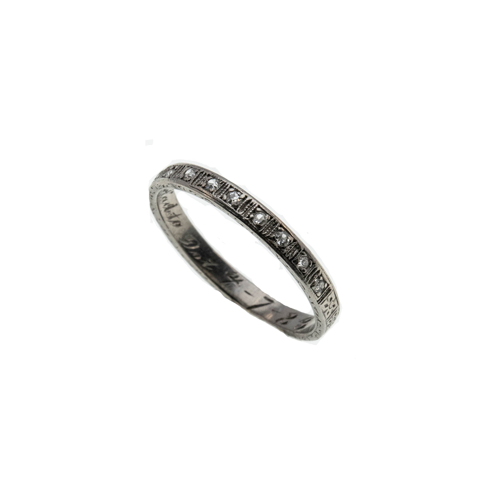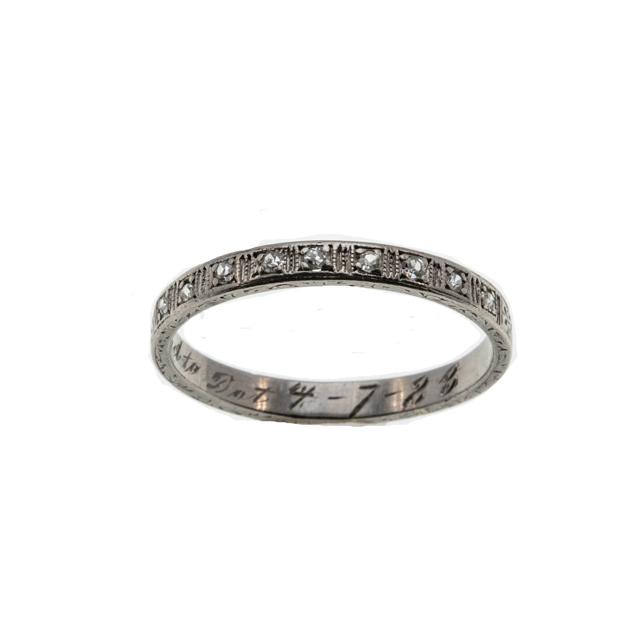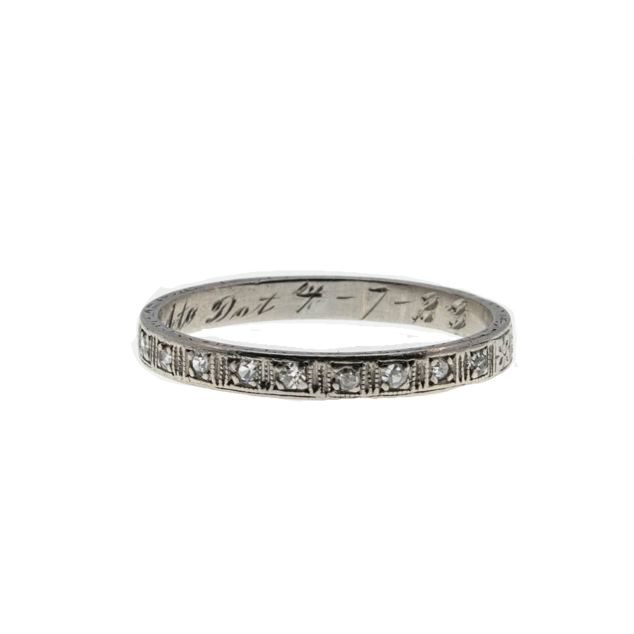 On This Day In 1923 - Art Deco Platinum Diamond Inscribed & Engraved Wedding Band Ring. This exquisite ring is crafted from platinum, tested, and confirmed with professional appraisal. Featuring nine single cut diamonds, exquisite detail, Art Deco era styling, and high quality craftsmanship. The galley on this ring is made up of delicate square settings, which are bead set with sparkling high quality diamonds. The back half of the ring is engraved with precious little forget me knot flowers ( a motif found in antique jewelry) which was often used for wedding rings. The ring also has a wonderful inscription inside the band, which reads Had to Dot 4-7-23, so this ring is over 100 years old. This Art Deco era ring is so special, truly a perfect wedding or anniversary band with history, or a wonderful piece to add to your antique jewelry collection.