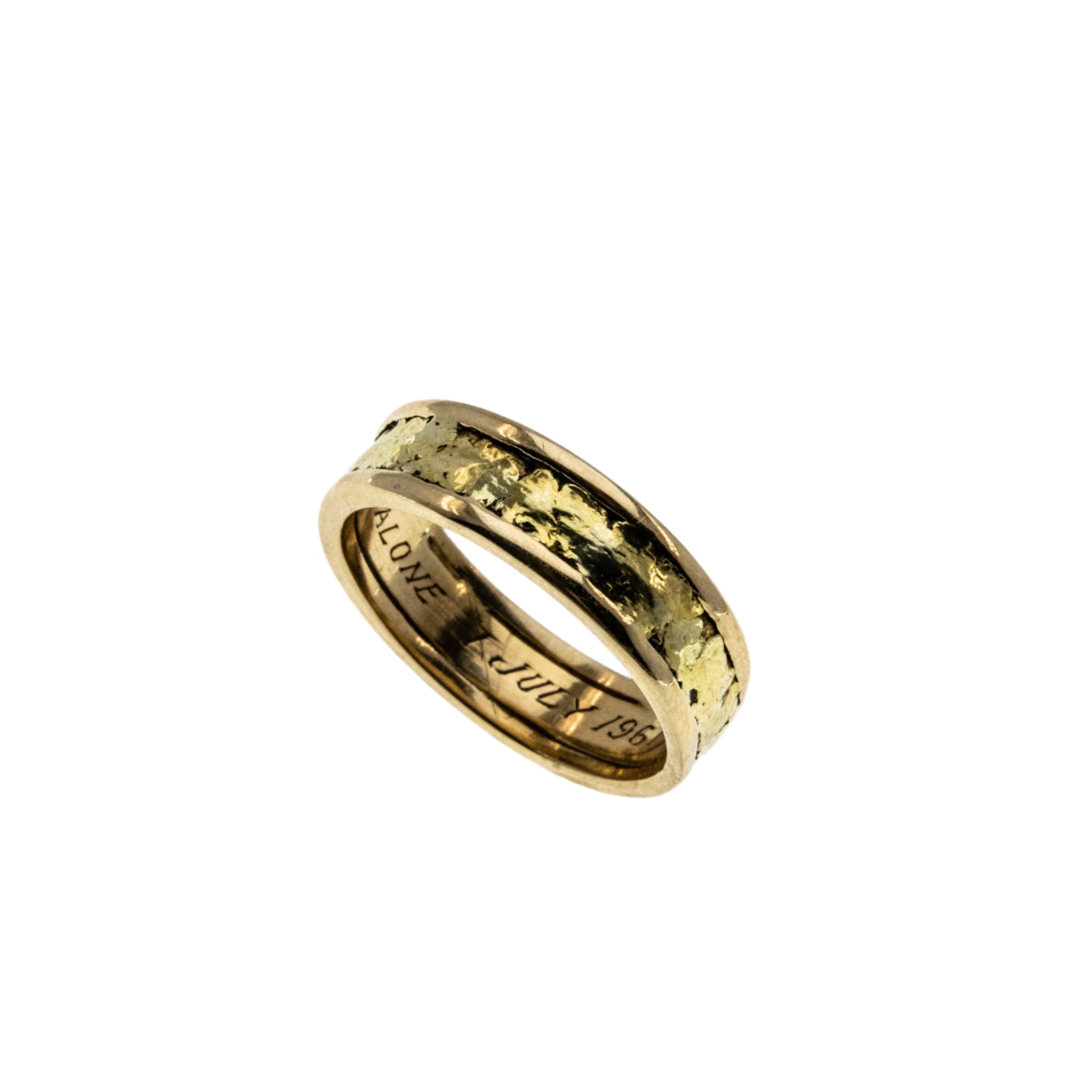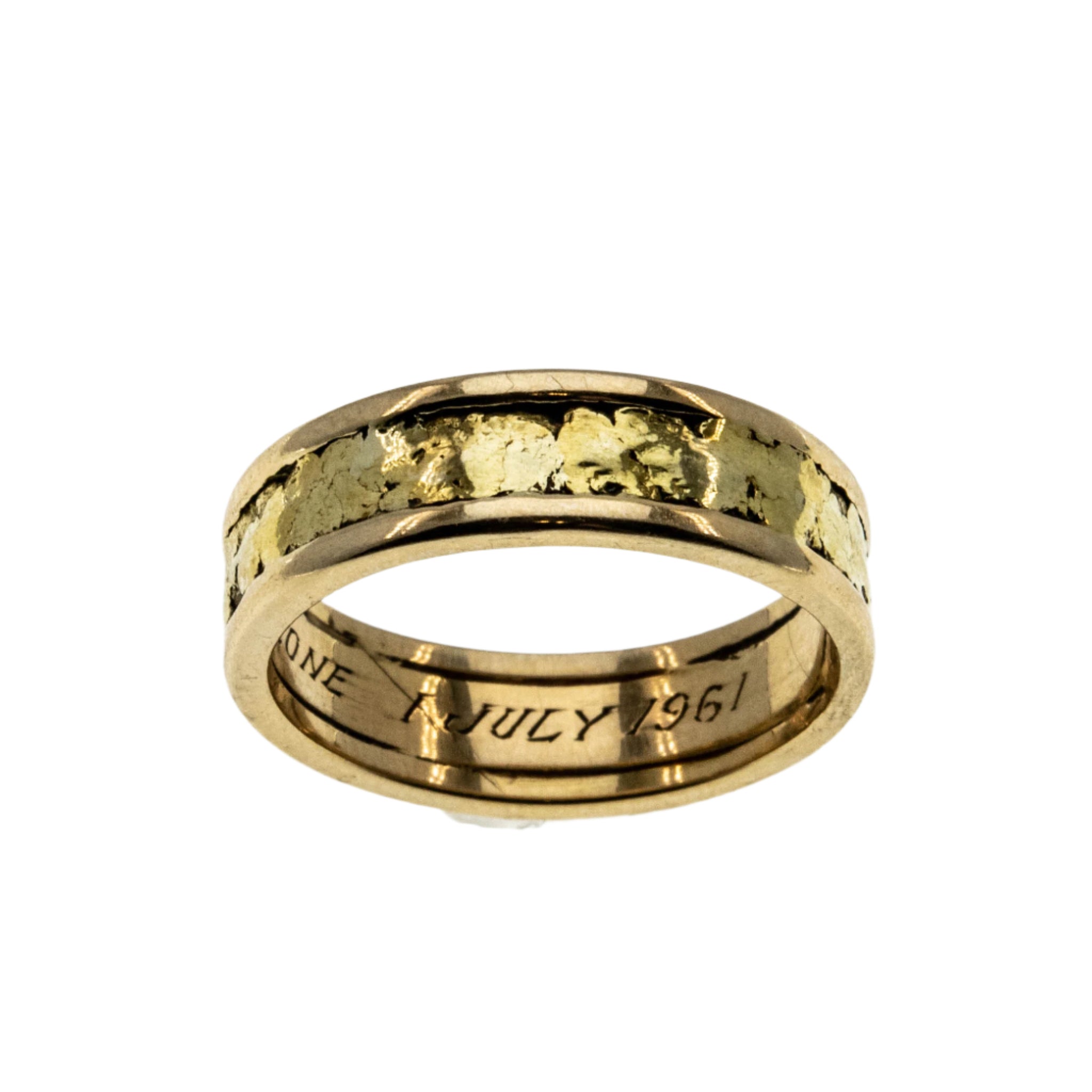 On This Day In 1961 - Vintage English 18K Gold Textured Wedding Band Ring. This wonderful wedding band is crafted from 18K yellow gold, hallmarked 18 for 18K, London assay, and a letter date 'e' for 1960.  The ring features vintage styling, full English hallmarks,  and quality craftsmanship. This unique wedding band exhibits a beautiful textured surround, which displays a rich gold aged patina. The ring is polished, and soooo smooth to the touch, which only comes with age. All the hallmarks are present on the inside of the ring, and a sentimental inscription, which reads YOURS ALONE 1 JULY 1961.  The band is solid, and comfortable to wear. This vintage wedding band would make a wonderful piece to be cherished and enjoyed for many years to come.
