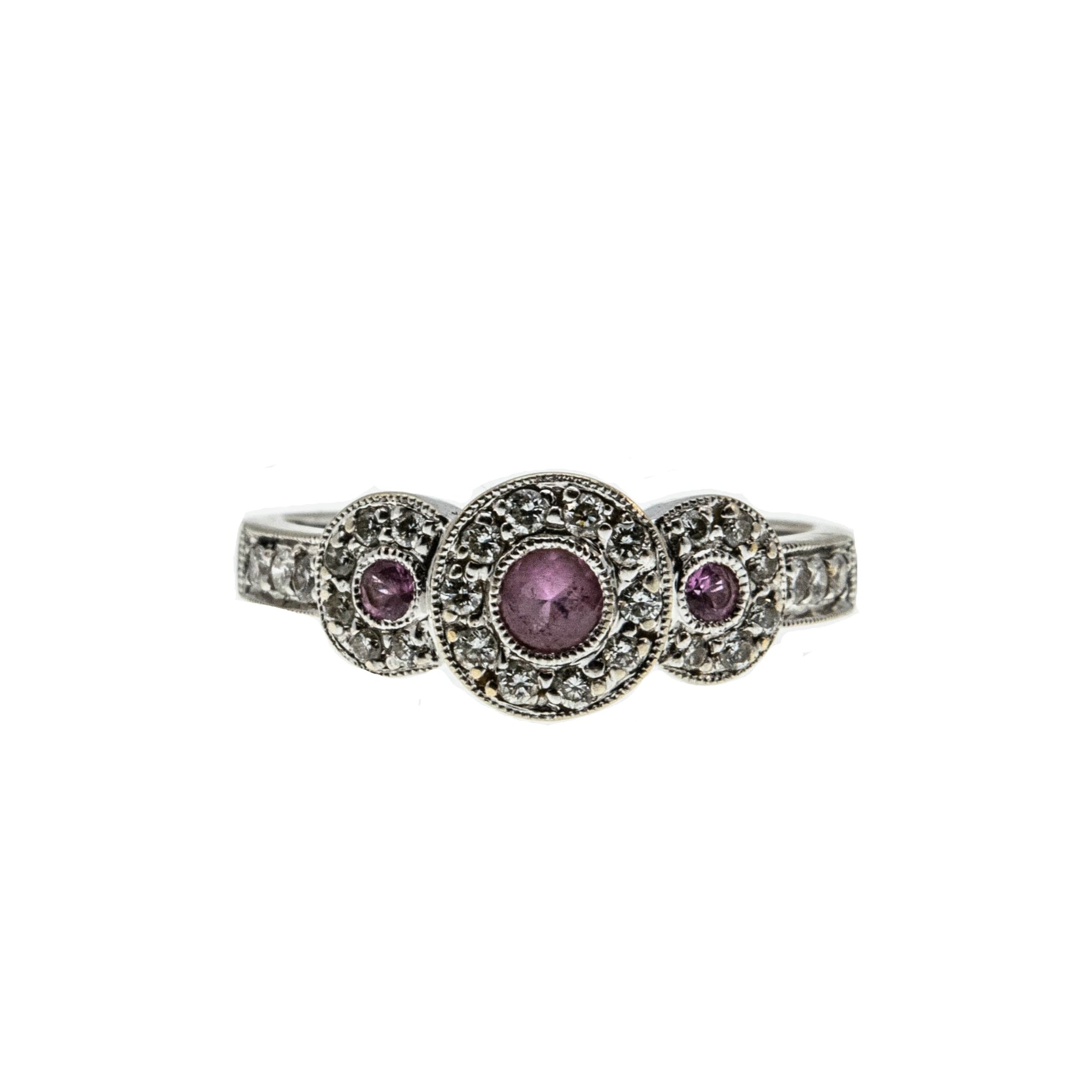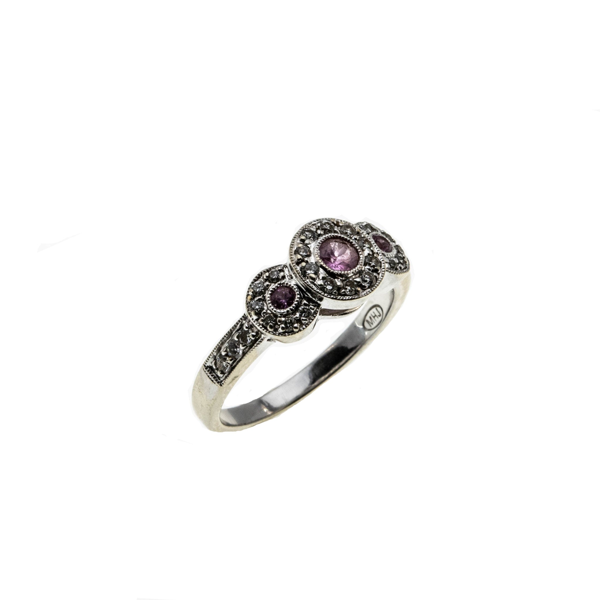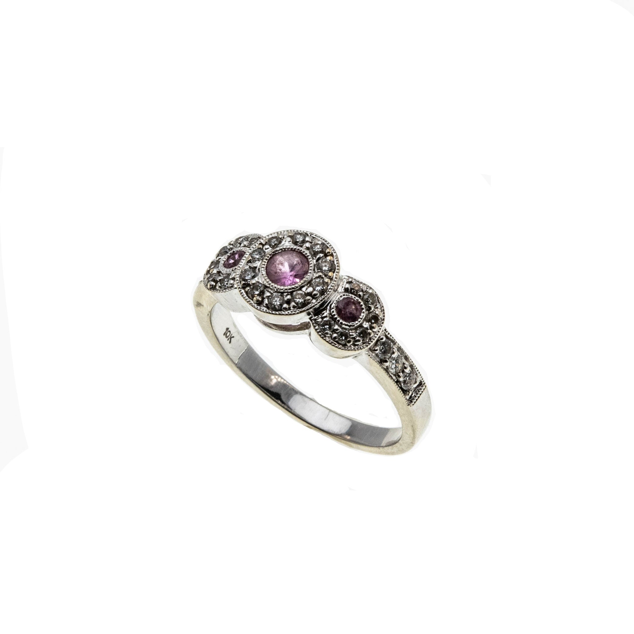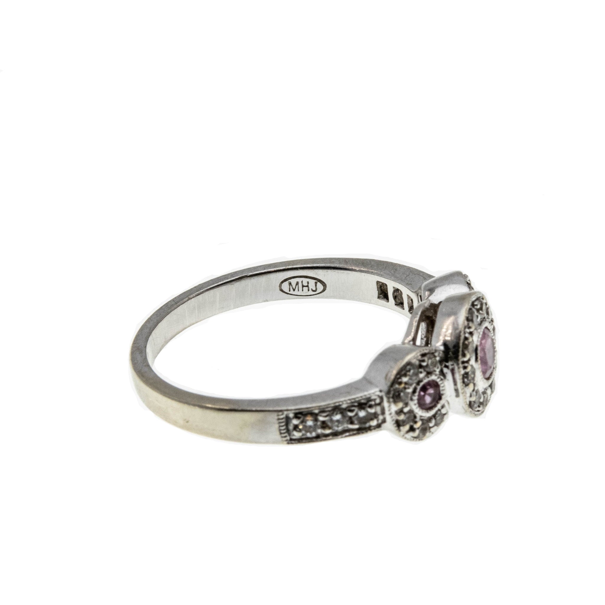 Sparkling Rosé - Estate 10K White Gold Pink Sapphire & Diamond Ring. This pretty ring is crafted from 10K white gold, hallmarked 10K, and a makers mark MHJ. The ring features 3 natural round cut pink sapphires, 28 natural full cut diamonds, Art Deco Revival styling, and quality craftsmanship. The gallery on this ring is made in the form of three circular discs, which are expertly bezel set with three beautiful pink sapphires. The pink sapphires are surrounded by sparkling diamonds, which continues down the shoulders of the ring. The shank is smooth and polished, which allows for a comfortable fit and easy sizing. This exquisite estate ring would make a unique engagement ring, gift, or a wonderful addition to any fine jewelry collection.