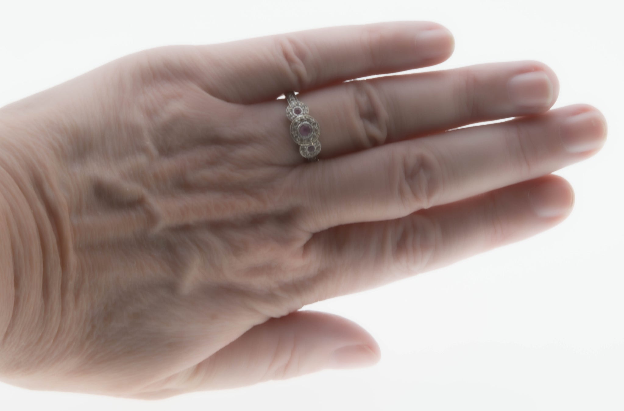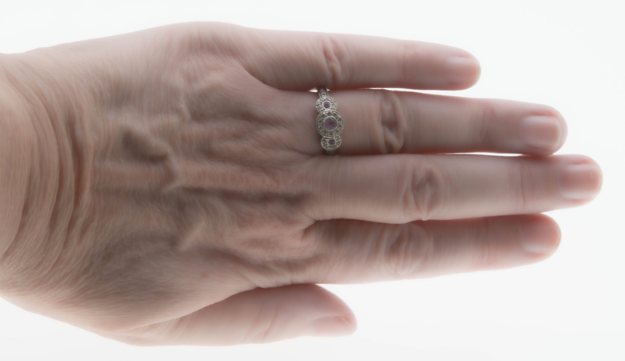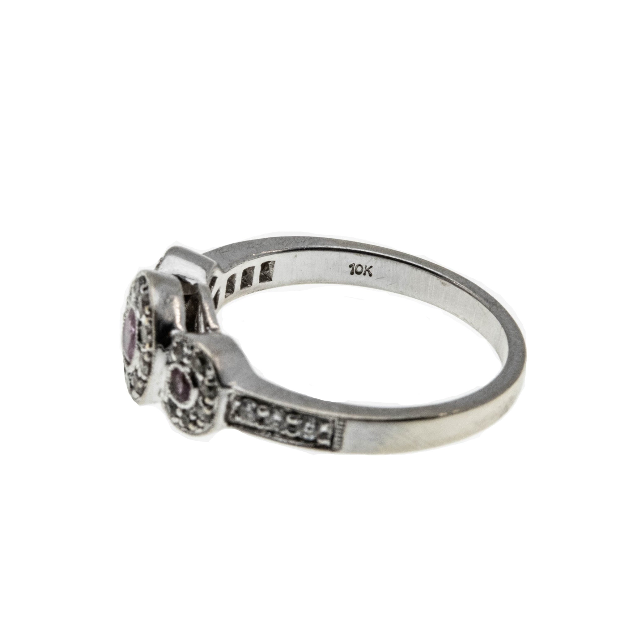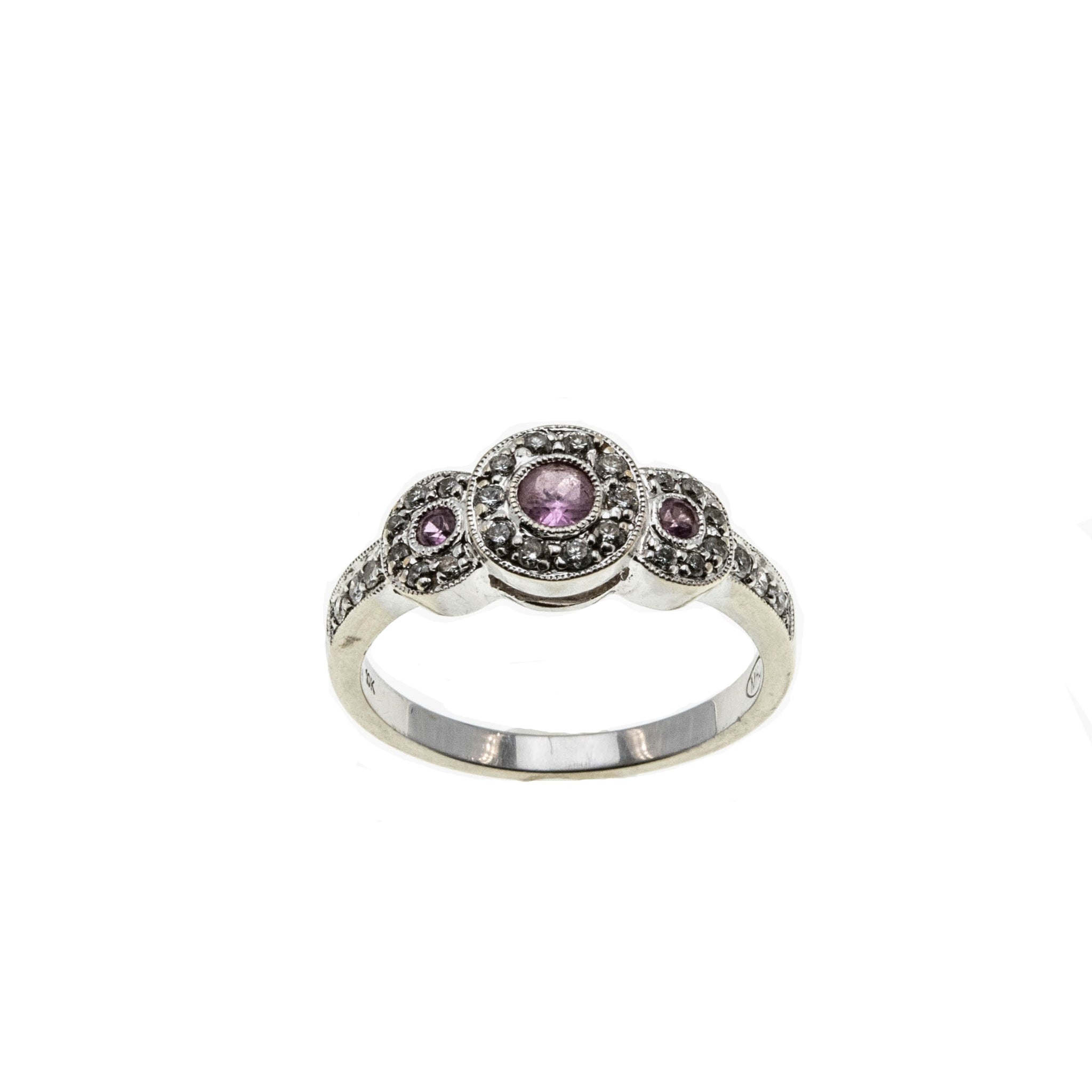 Sparkling Rosé - Estate 10K White Gold Pink Sapphire & Diamond Ring. This pretty ring is crafted from 10K white gold, hallmarked 10K, and a makers mark MHJ. The ring features 3 natural round cut pink sapphires, 28 natural full cut diamonds, Art Deco Revival styling, and quality craftsmanship. The gallery on this ring is made in the form of three circular discs, which are expertly bezel set with three beautiful pink sapphires. The pink sapphires are surrounded by sparkling diamonds, which continues down the shoulders of the ring. The shank is smooth and polished, which allows for a comfortable fit and easy sizing. This exquisite estate ring would make a unique engagement ring, gift, or a wonderful addition to any fine jewelry collection.