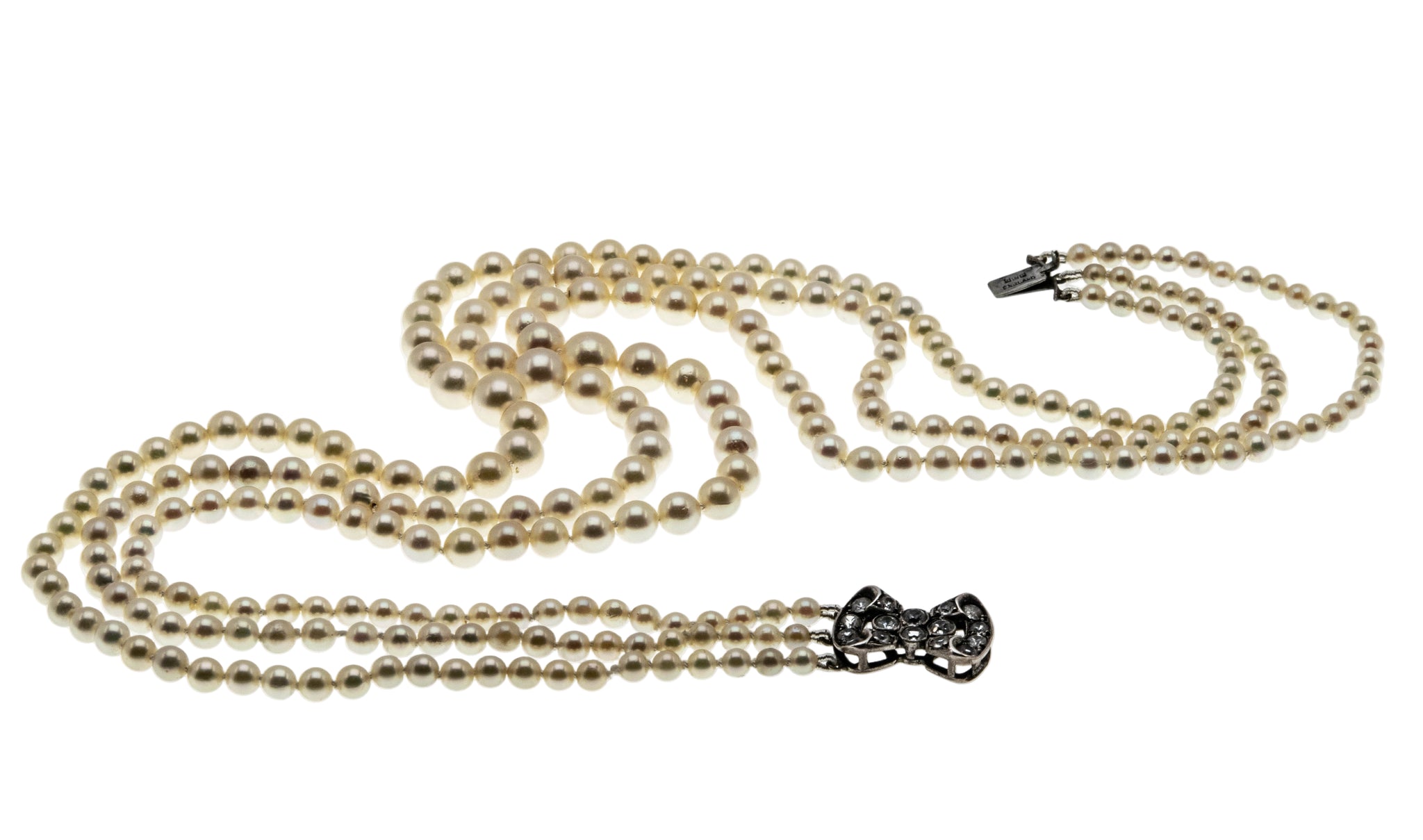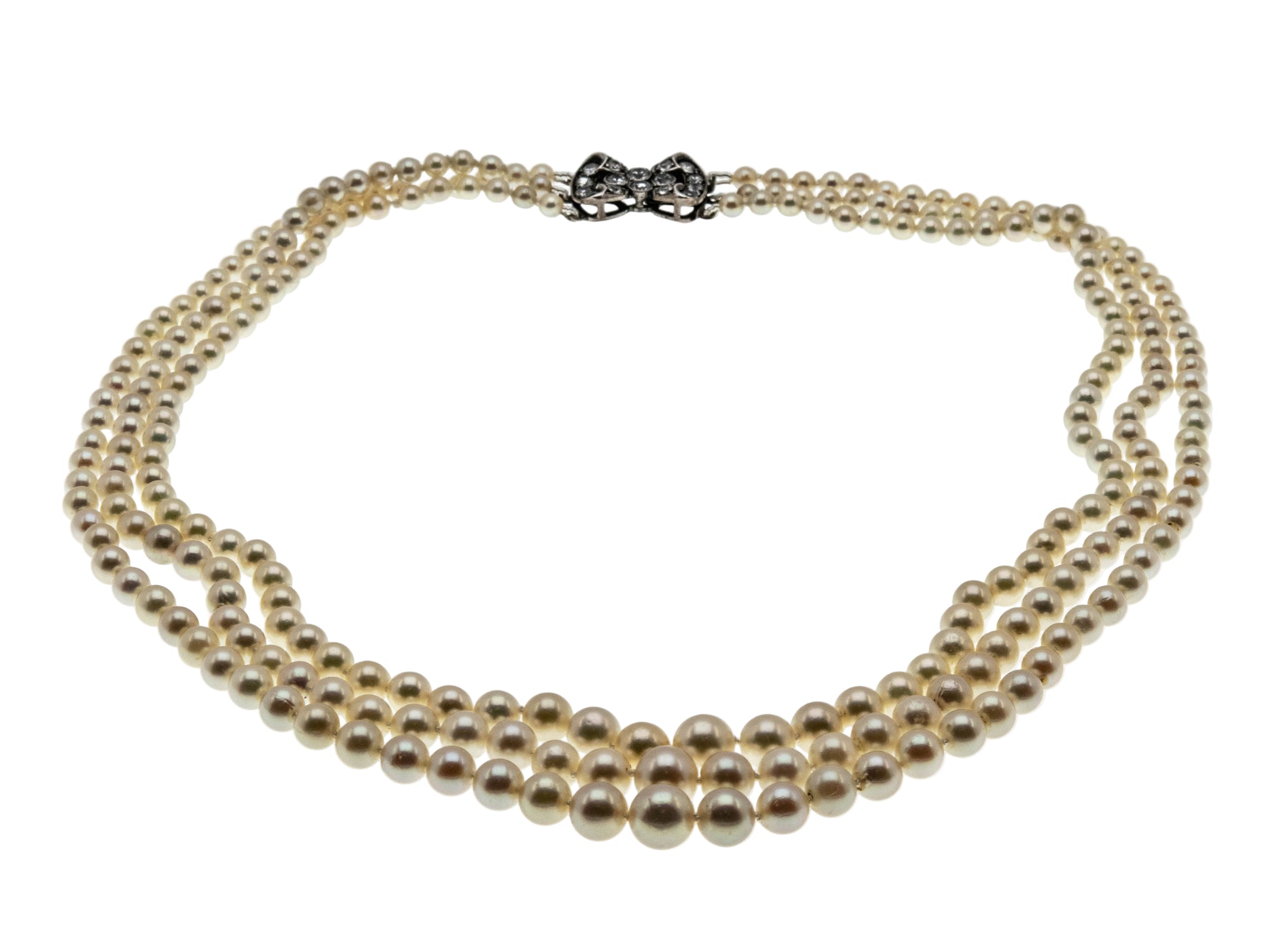Comments: Beautiful triple strand of pearls. These have been restrung by Birks with silk thread, and the pearls have been professionally cleaned. Wonderful Art Deco example.