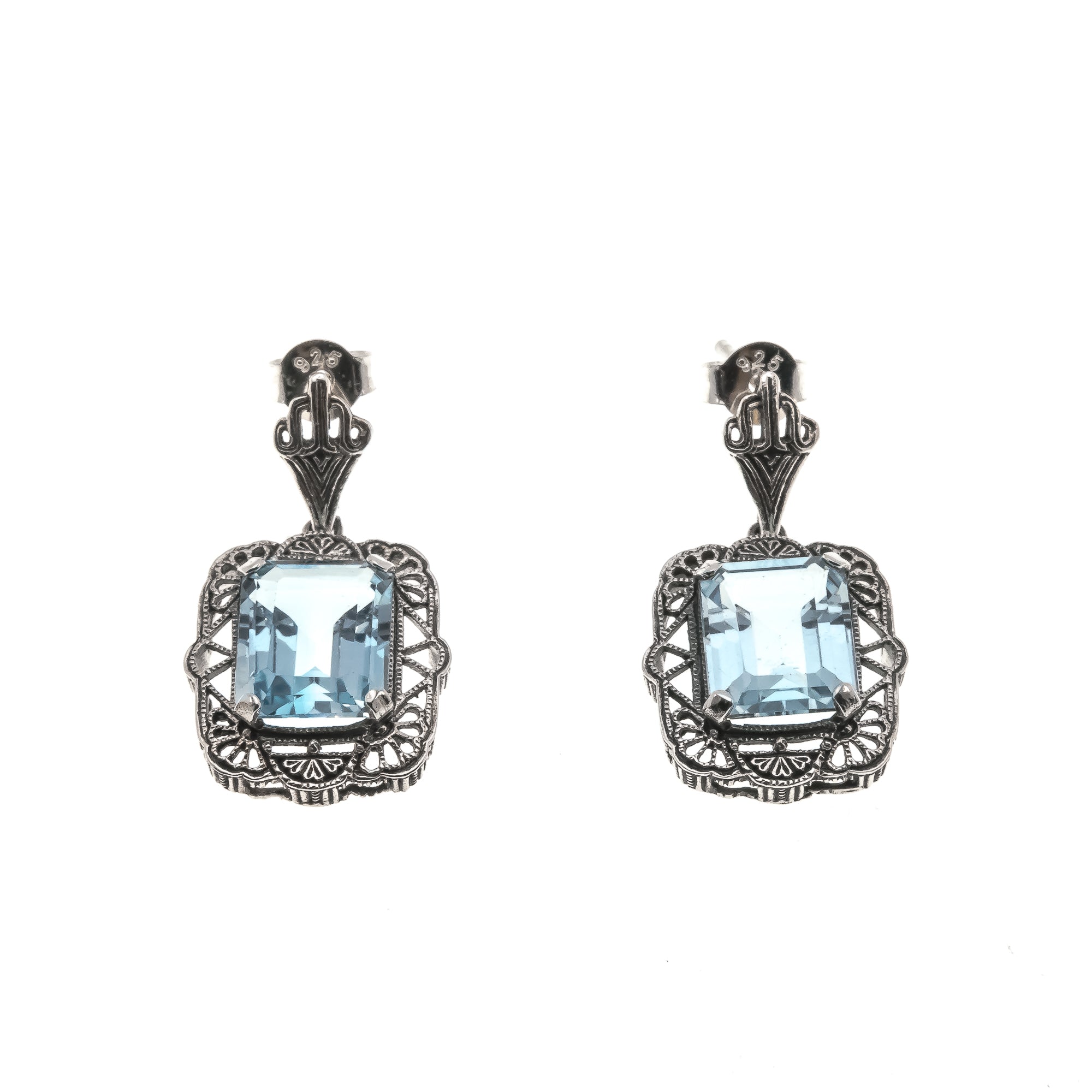 Tranquil Blue - Estate Sterling Silver Blue Topaz Filigree Earrings . These gorgeous Estate earrings are crafted from sterling silver, hallmarked 925 SS for sterling.  Featuring 2 genuine emerald cut blue topaz gemstones, exquisite filigree work and detail.  These earrings have a lovely shape, and displays a sea of filigree that frame the topaz. The expertly claw set topaz gems have a beautiful sky blue colour, displaying much sparkle and shine. . They are for pierced ears and feature posts and secure butterfly backings. These Art Deco Revival earrings would make perfect wedding earrings, gift or wonderful addition to any fine jewelry collection.