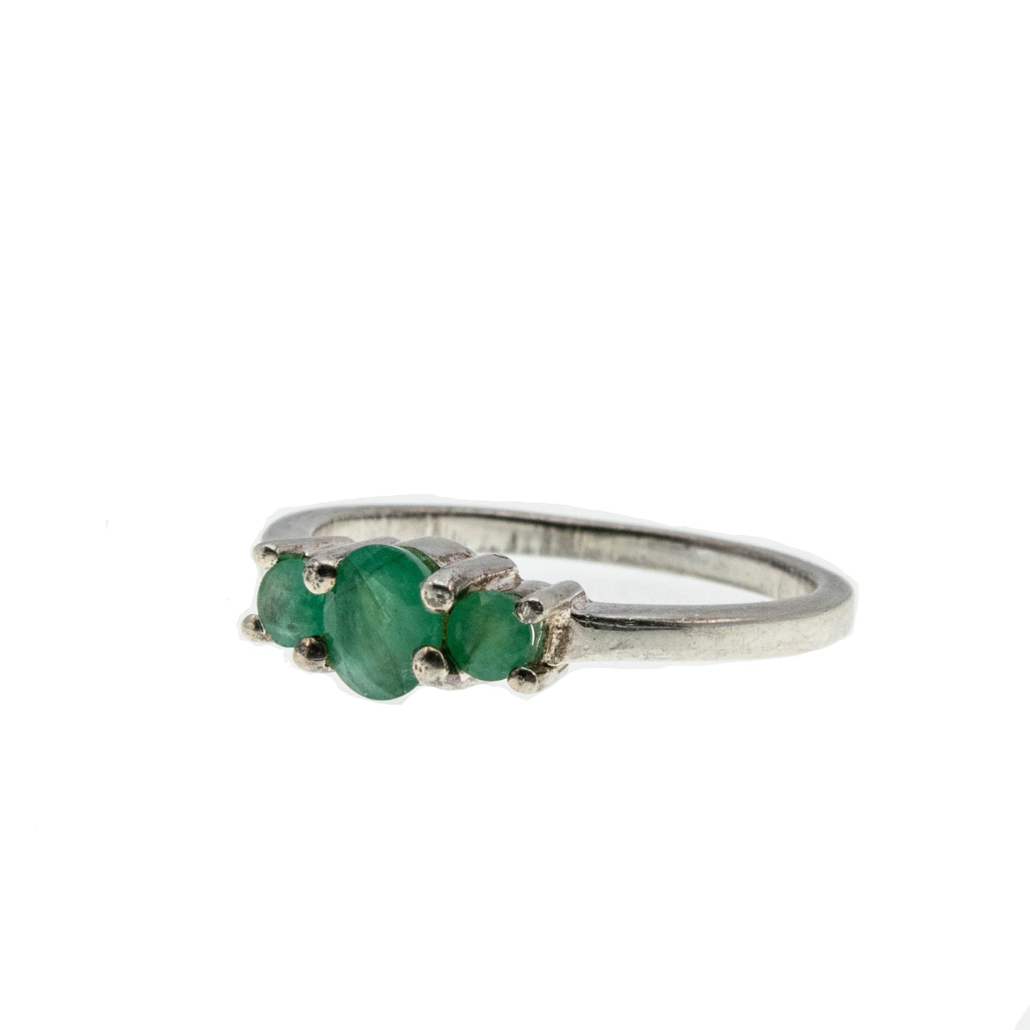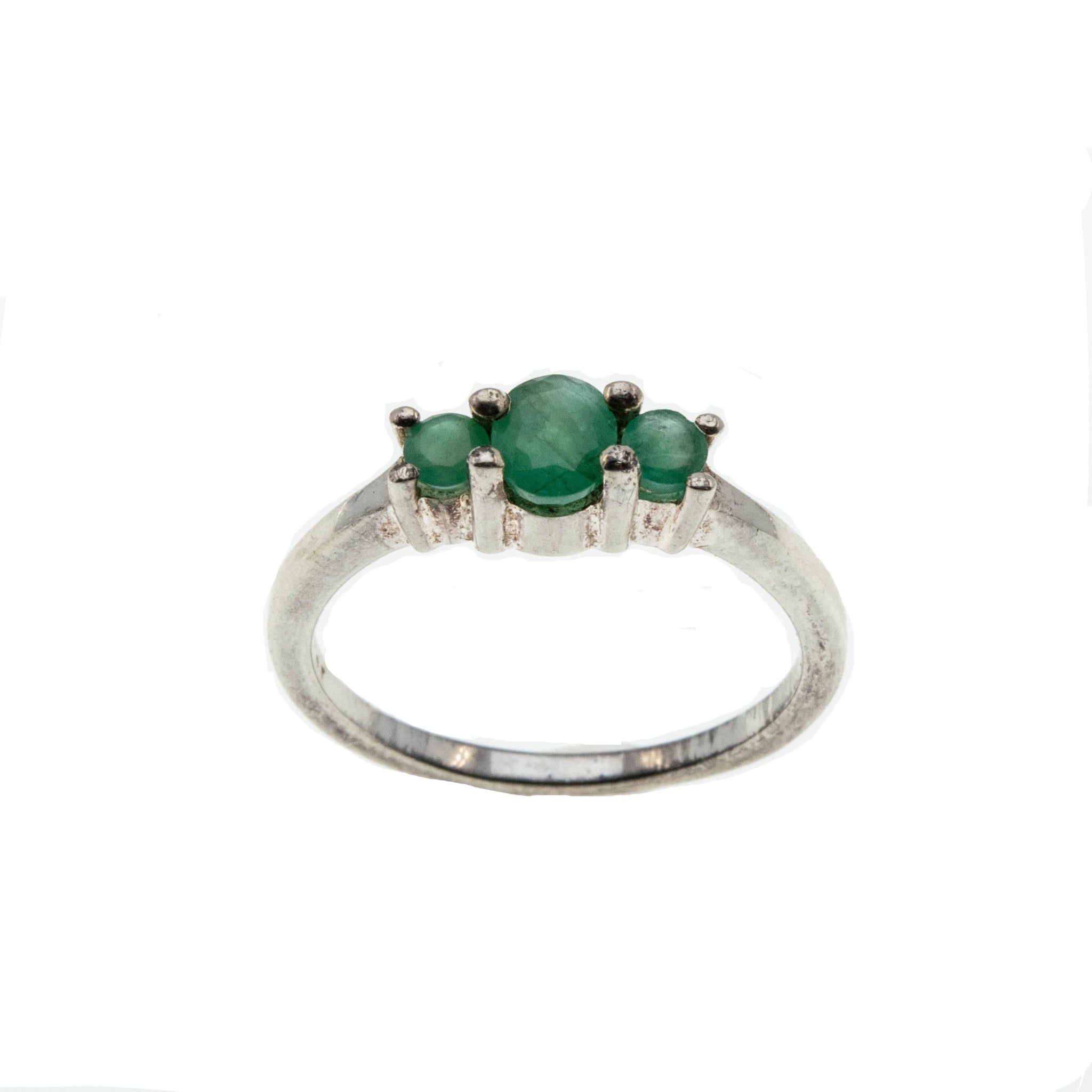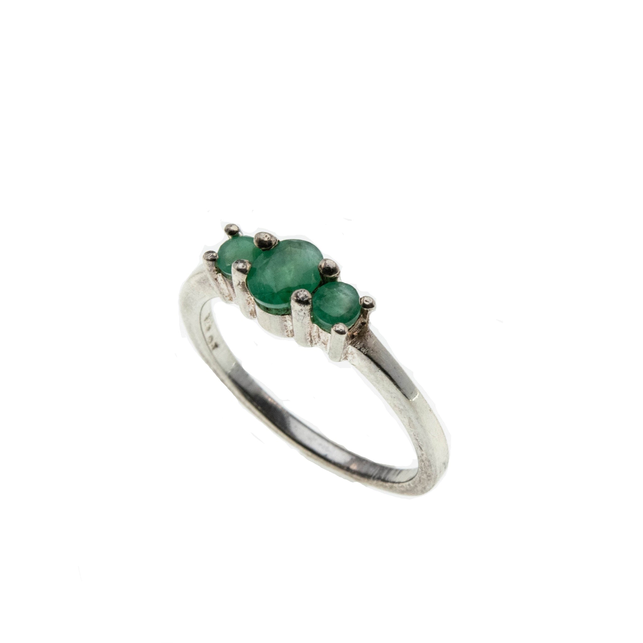 Trio Of Emeralds - Estate Sterling Silver Emerald Three Stone ring. This pretty ring is crafted from sterling silver, hallmarked 925, and makers initials QJ. Featuring one genuine oval cut faceted emerald, two genuine round cut faceted emeralds, and a classic style. The gallery on this ring showcases expertly claw-set green emeralds, displaying a greenish/yellowish hue. The central emerald is a larger emerald, which is flanked by a smaller oval emerald on each side. The shoulders are sleek and polished, leading down to a smooth and polished shank, which allows for a comfortable fit and easy sizing. This Estate ring makes a wonderful addition to any jewelry collection.