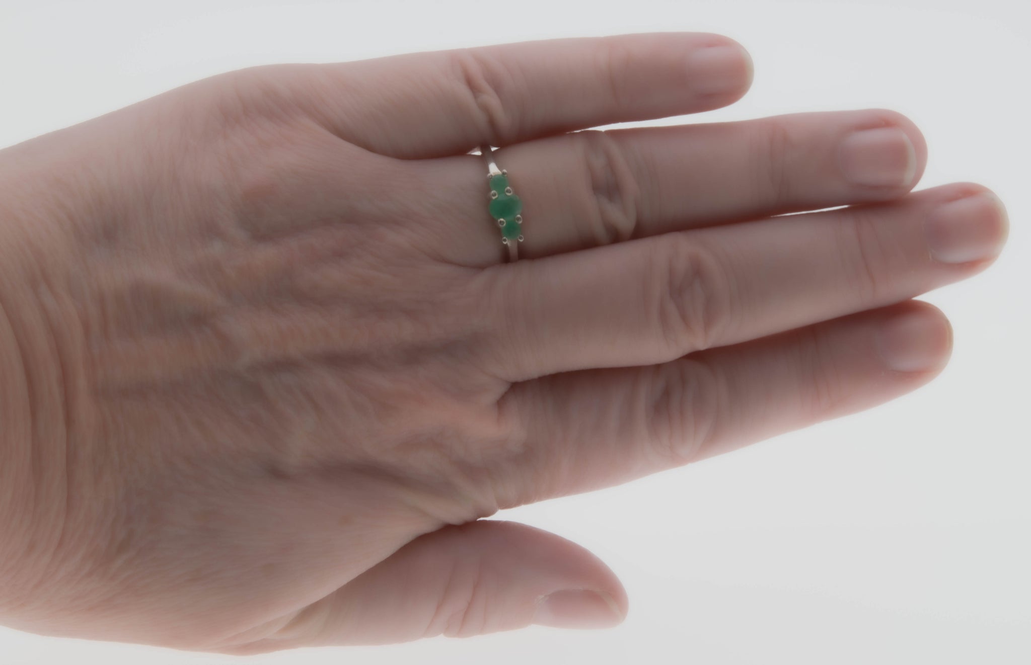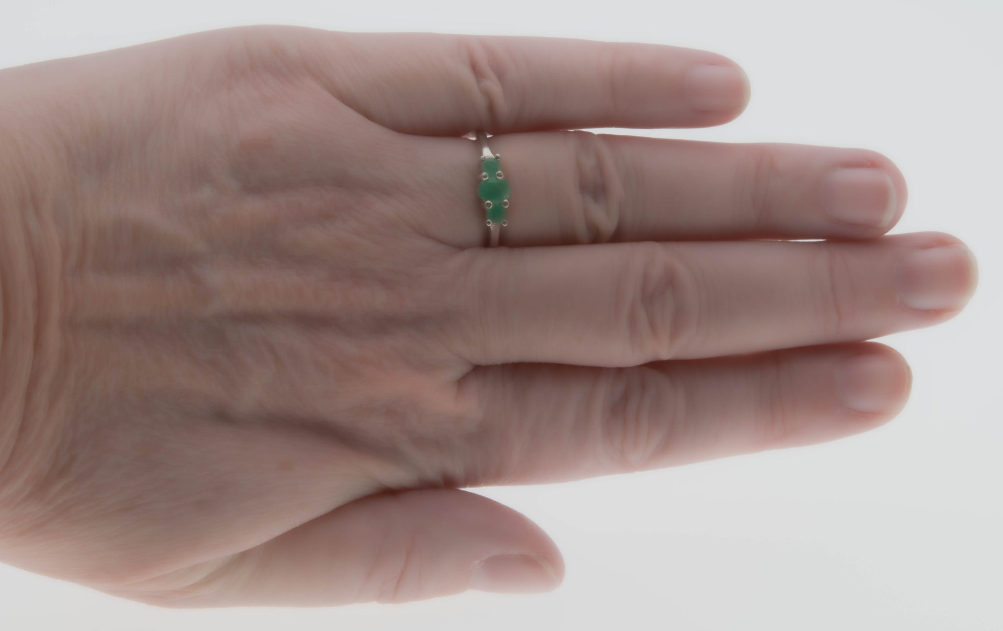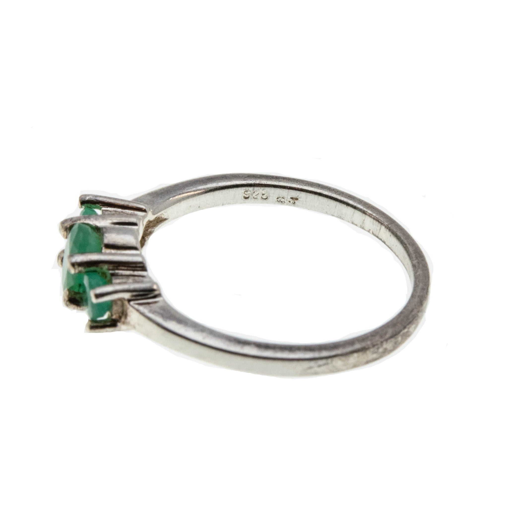 Trio Of Emeralds - Estate Sterling Silver Emerald Three Stone ring. This pretty ring is crafted from sterling silver, hallmarked 925, and makers initials QJ. Featuring one genuine oval cut faceted emerald, two genuine round cut faceted emeralds, and a classic style. The gallery on this ring showcases expertly claw-set green emeralds, displaying a greenish/yellowish hue. The central emerald is a larger emerald, which is flanked by a smaller oval emerald on each side. The shoulders are sleek and polished, leading down to a smooth and polished shank, which allows for a comfortable fit and easy sizing. This Estate ring makes a wonderful addition to any jewelry collection.