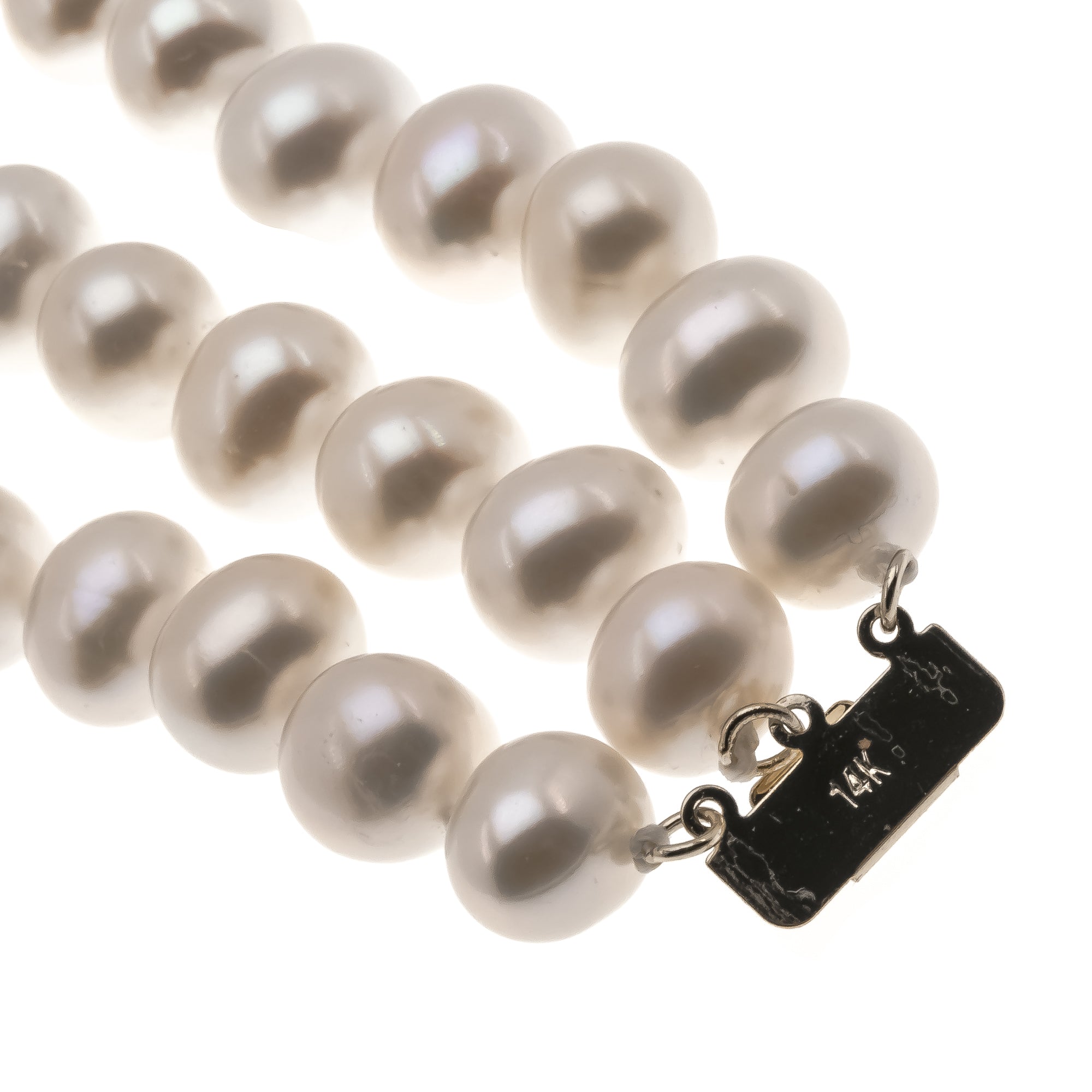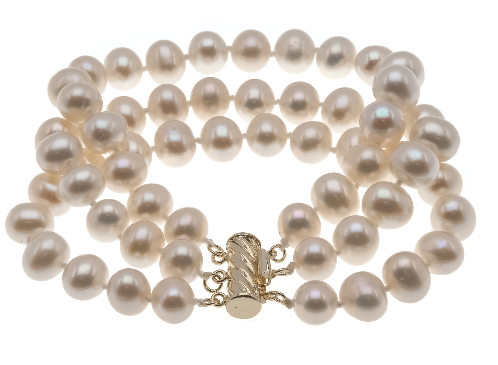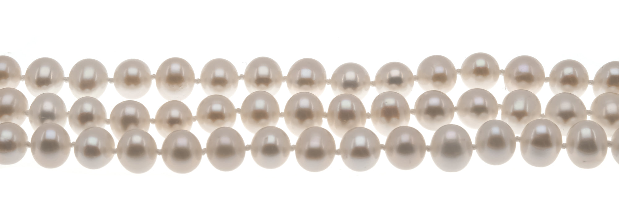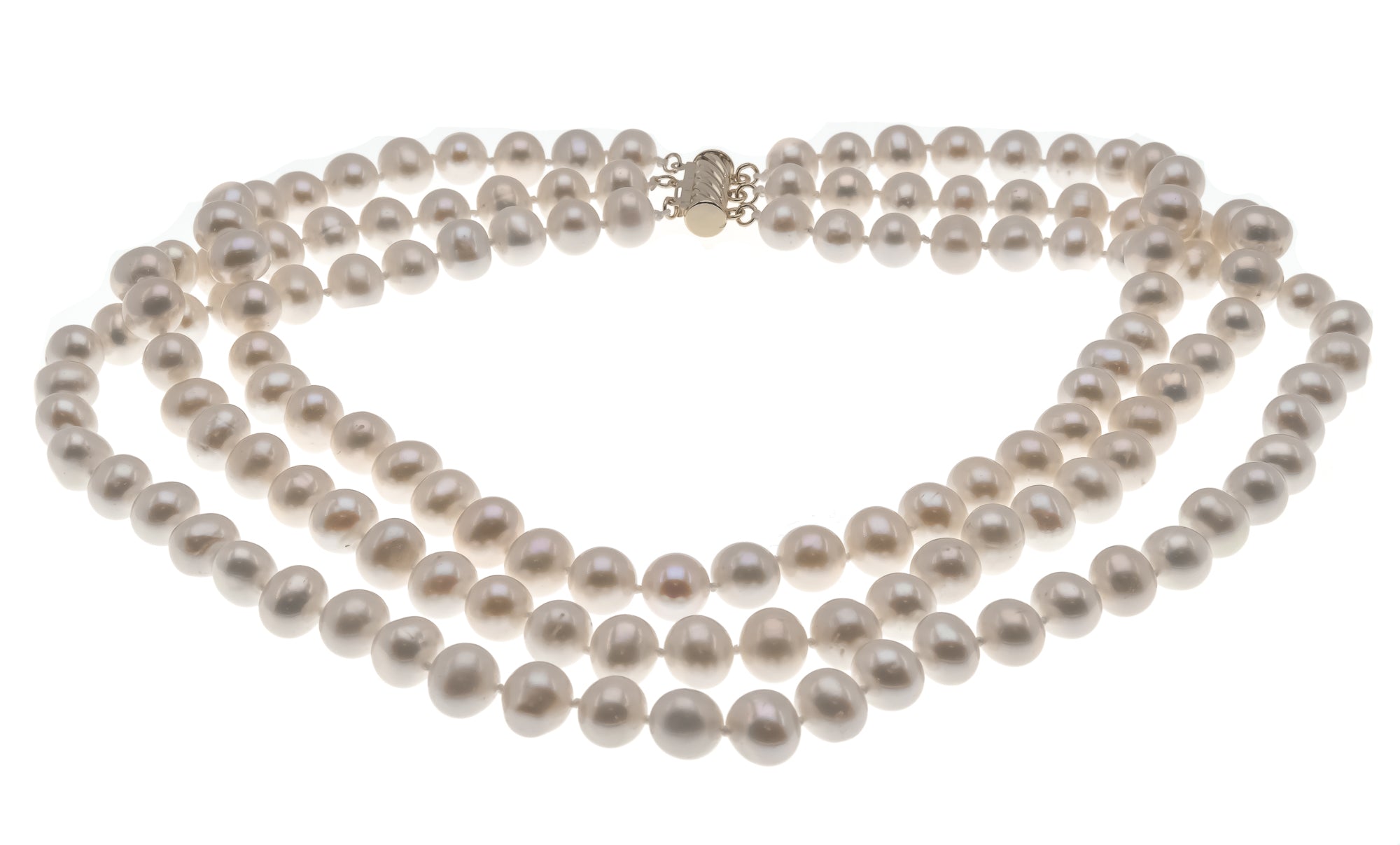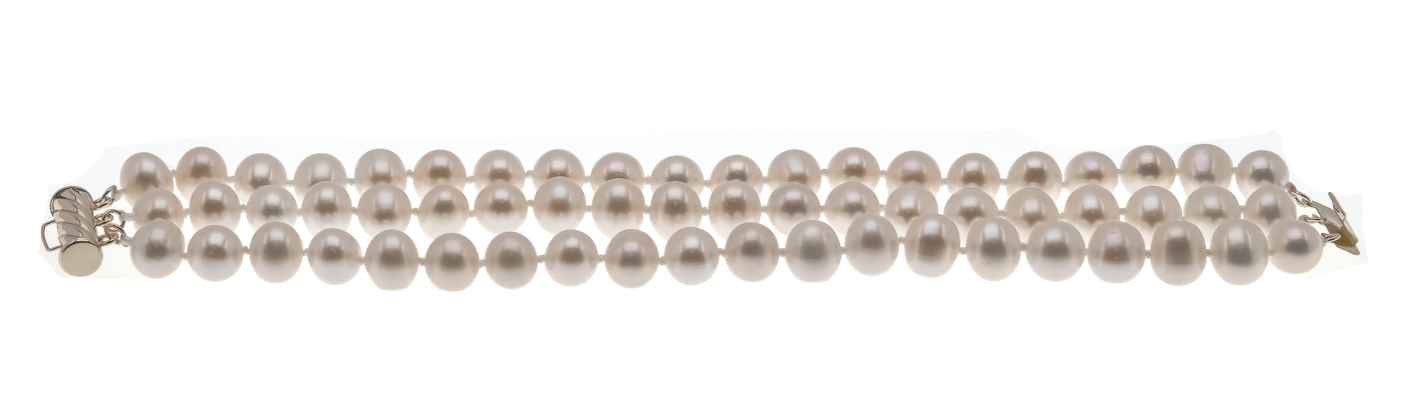 Triple Threat - Estate 14K GF Cultured Pearl Necklace & Bracelet Set. This fabulous set is crafted from 14K gold filled metal. Featuring genuine Cultured pearls and classic styling. This gorgeous set exhibits triple knotted strands of luminous white pearls, with a white rose overtone. The clasps have a safety feature and simply slips into place. The necklace and bracelet drapes beautifully and adds class and elegance to any outfit.