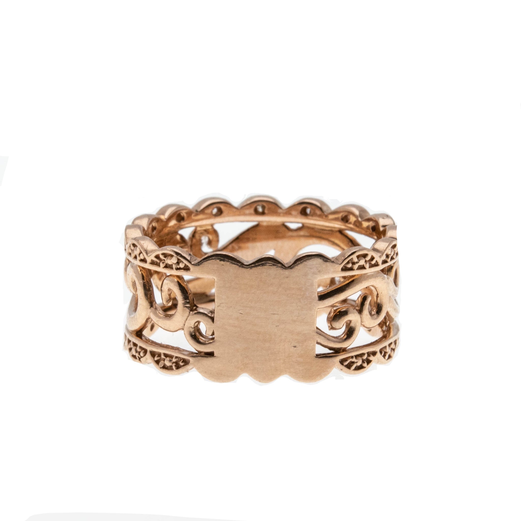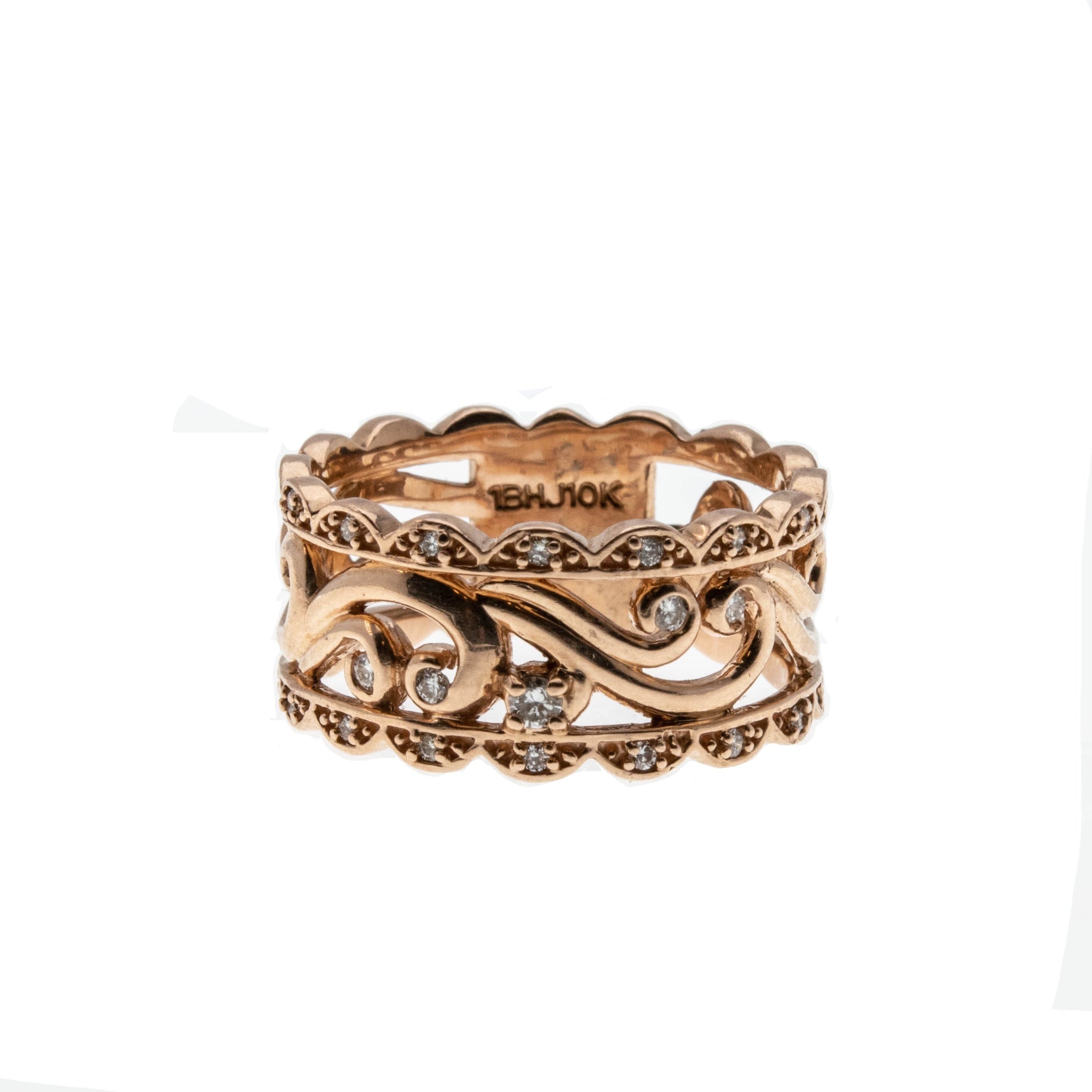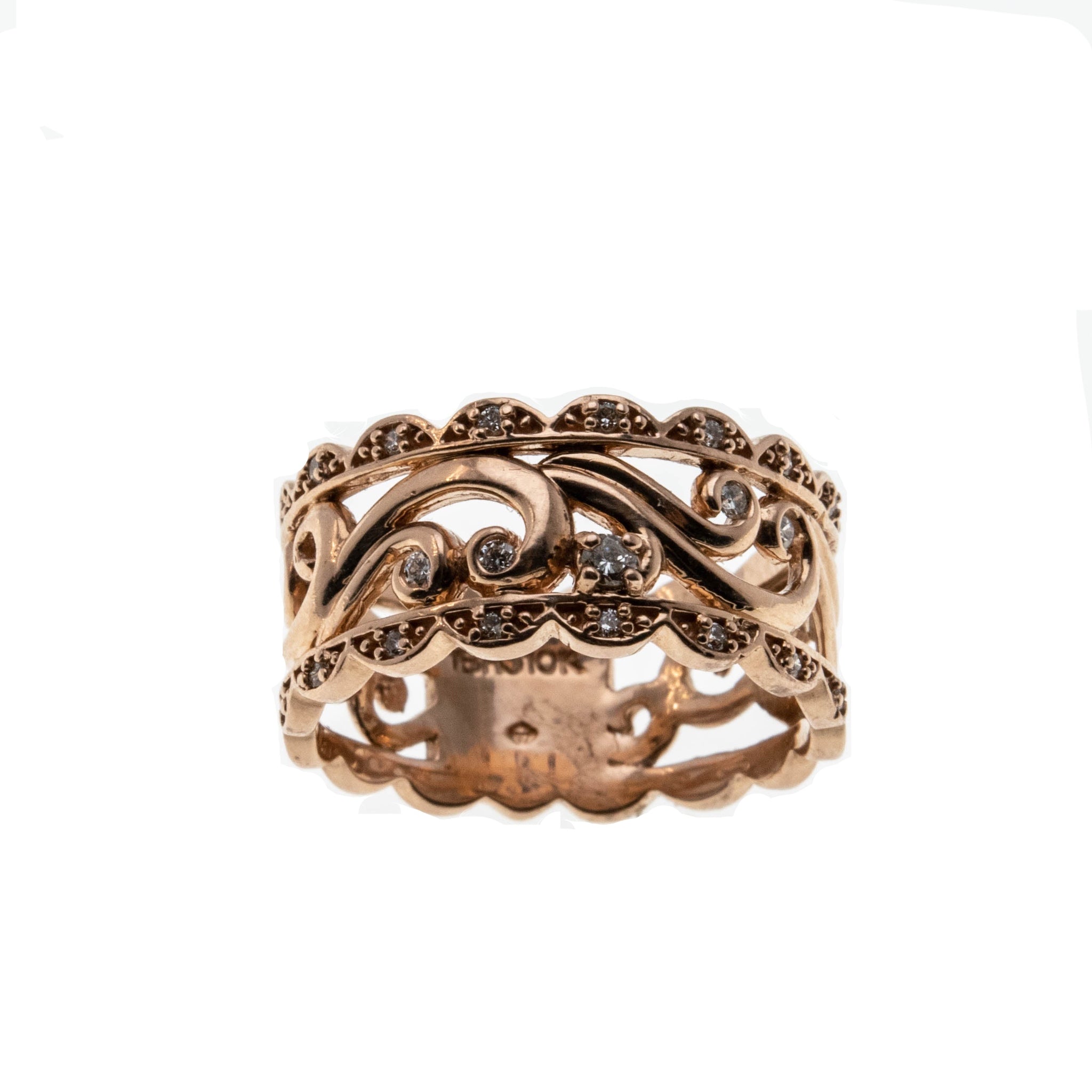Victorian Revival - Estate 10K Rose Gold Scroll & Diamond Open-Work Ring. This stunning ring is crafted from 10K rose gold, hallmarked 10K.  Featuring 19 natural diamonds, Victorian Revival styling, and quality craftsmanship.  This ring is so beautiful, an exquisite open-worked scalloped wide band, adorned by sparkling diamonds, is such an eye-catcher.  The back has a solid back section, which allows for easy sizing. This Estate Victorian Revival ring looks stunning when worn, it truly would make a unique wedding ring, gift or addition to any fine jewelry collection.