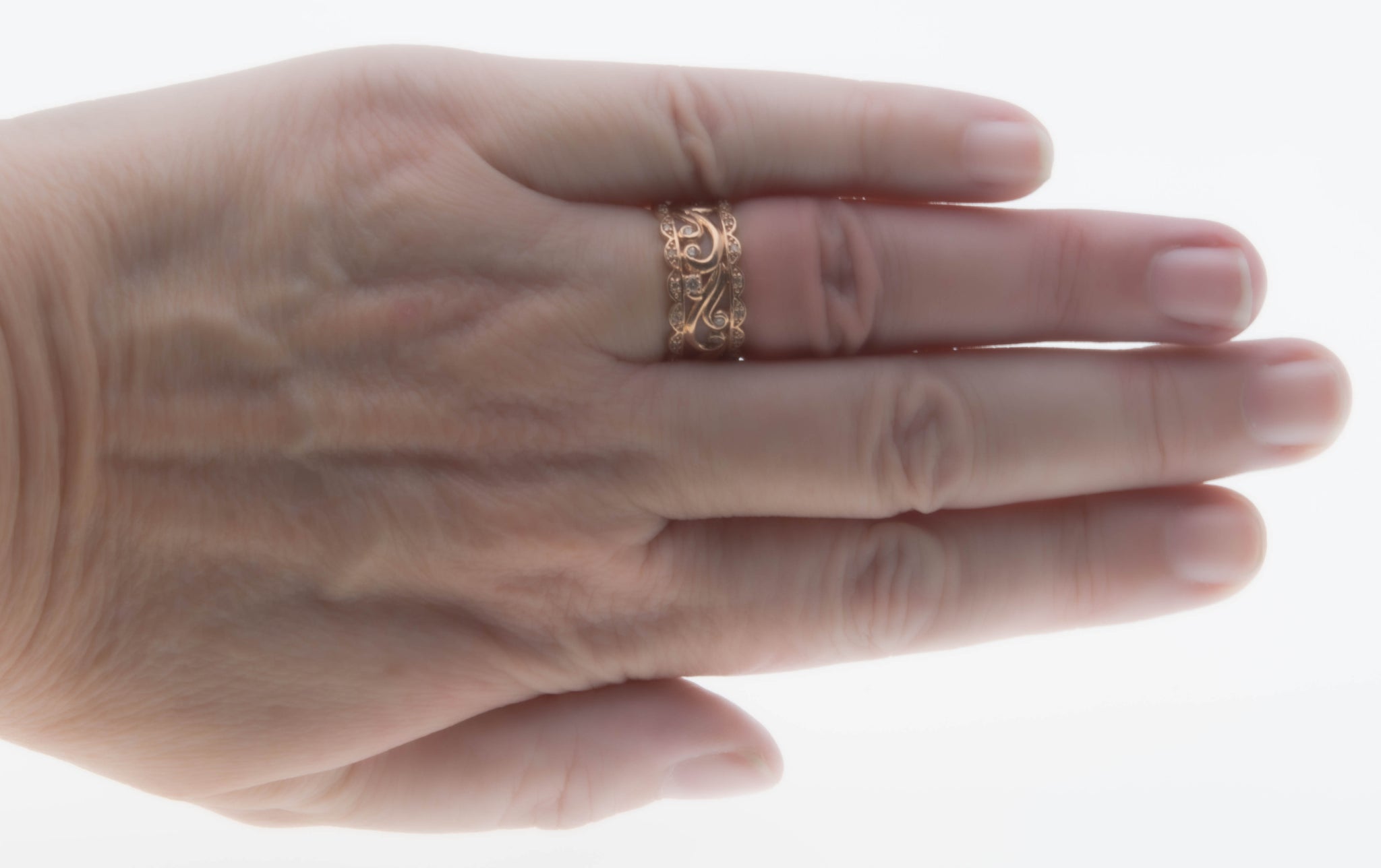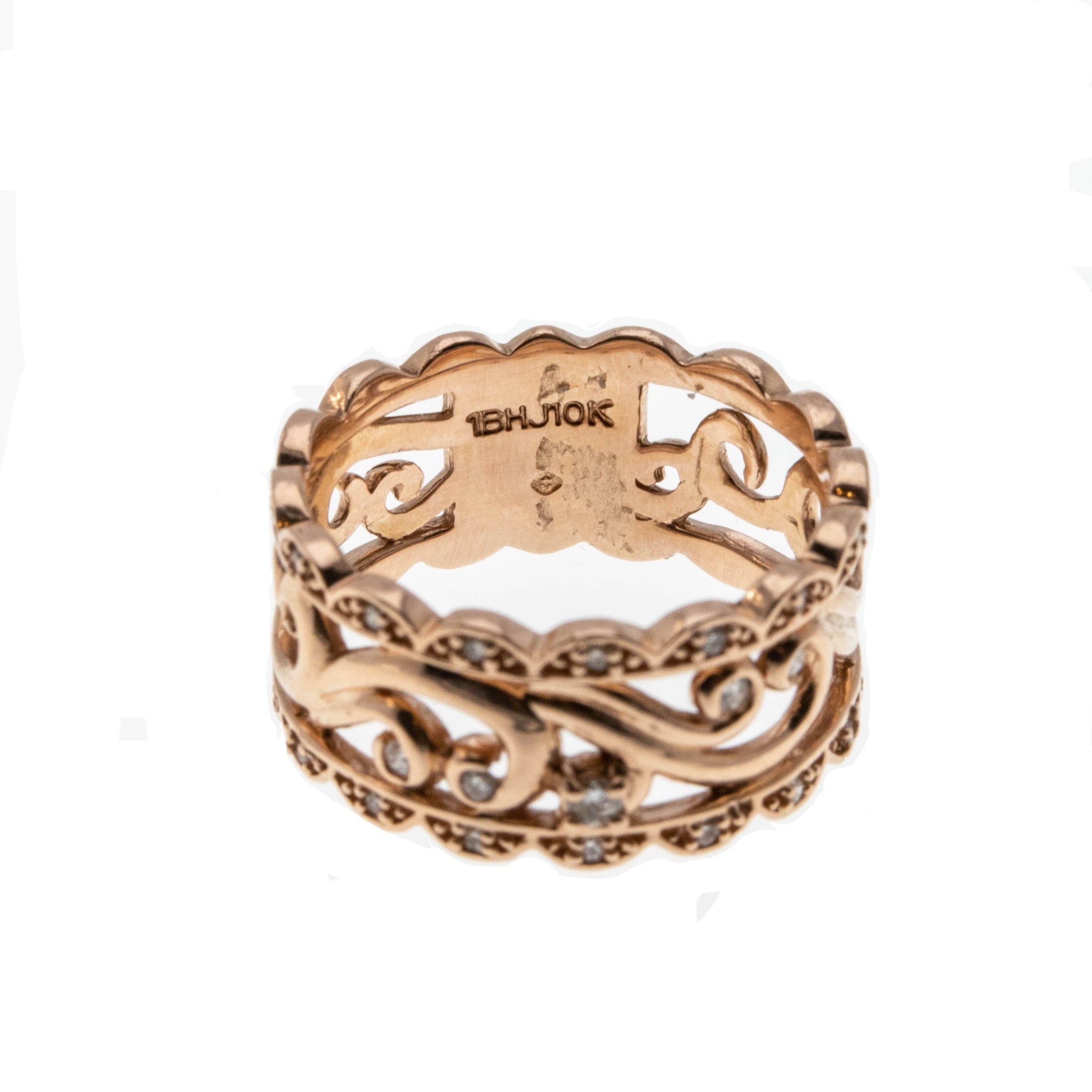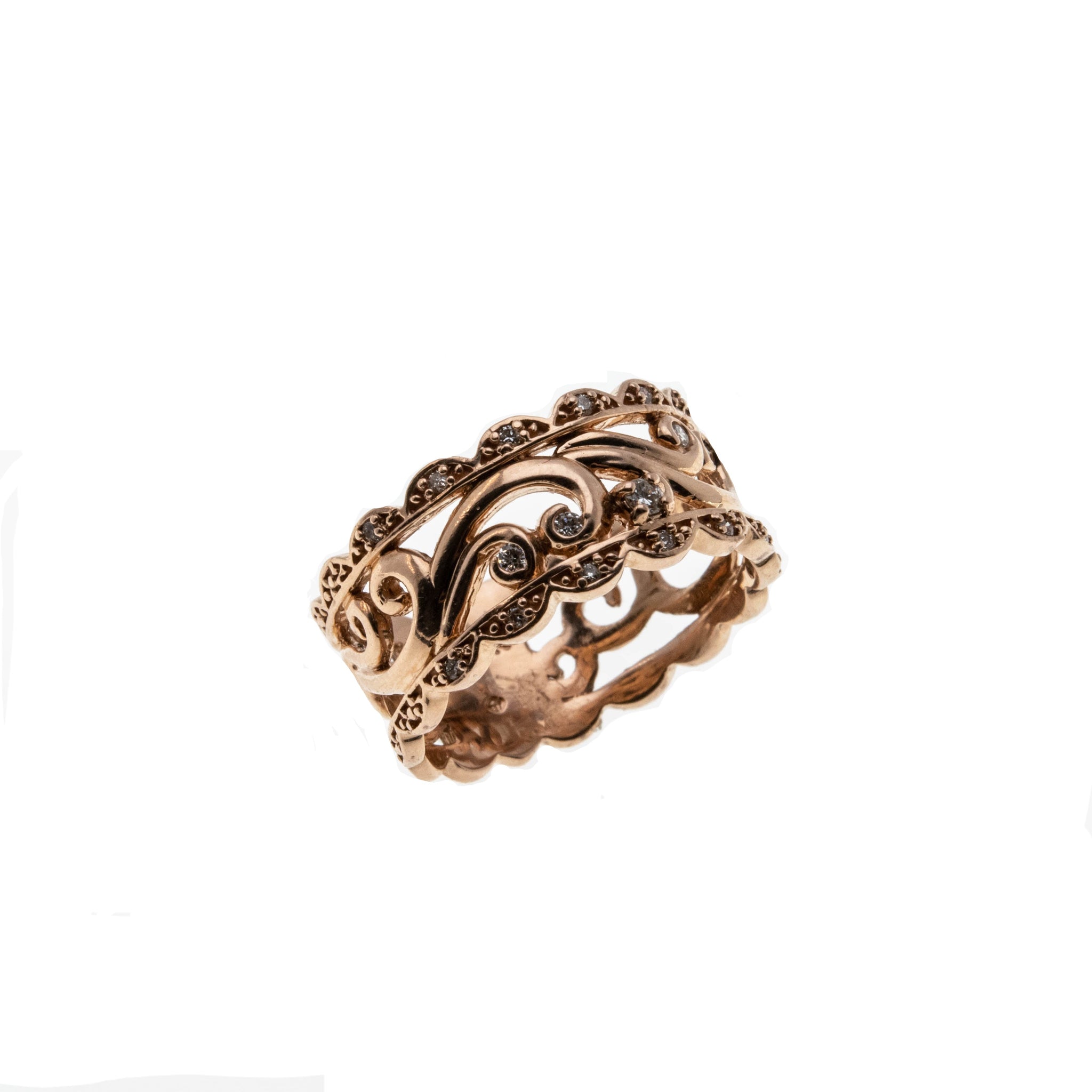 Victorian Revival - Estate 10K Rose Gold Scroll & Diamond Open-Work Ring. This stunning ring is crafted from 10K rose gold, hallmarked 10K.  Featuring 19 natural diamonds, Victorian Revival styling, and quality craftsmanship.  This ring is so beautiful, an exquisite open-worked scalloped wide band, adorned by sparkling diamonds, is such an eye-catcher.  The back has a solid back section, which allows for easy sizing. This Estate Victorian Revival ring looks stunning when worn, it truly would make a unique wedding ring, gift or addition to any fine jewelry collection.