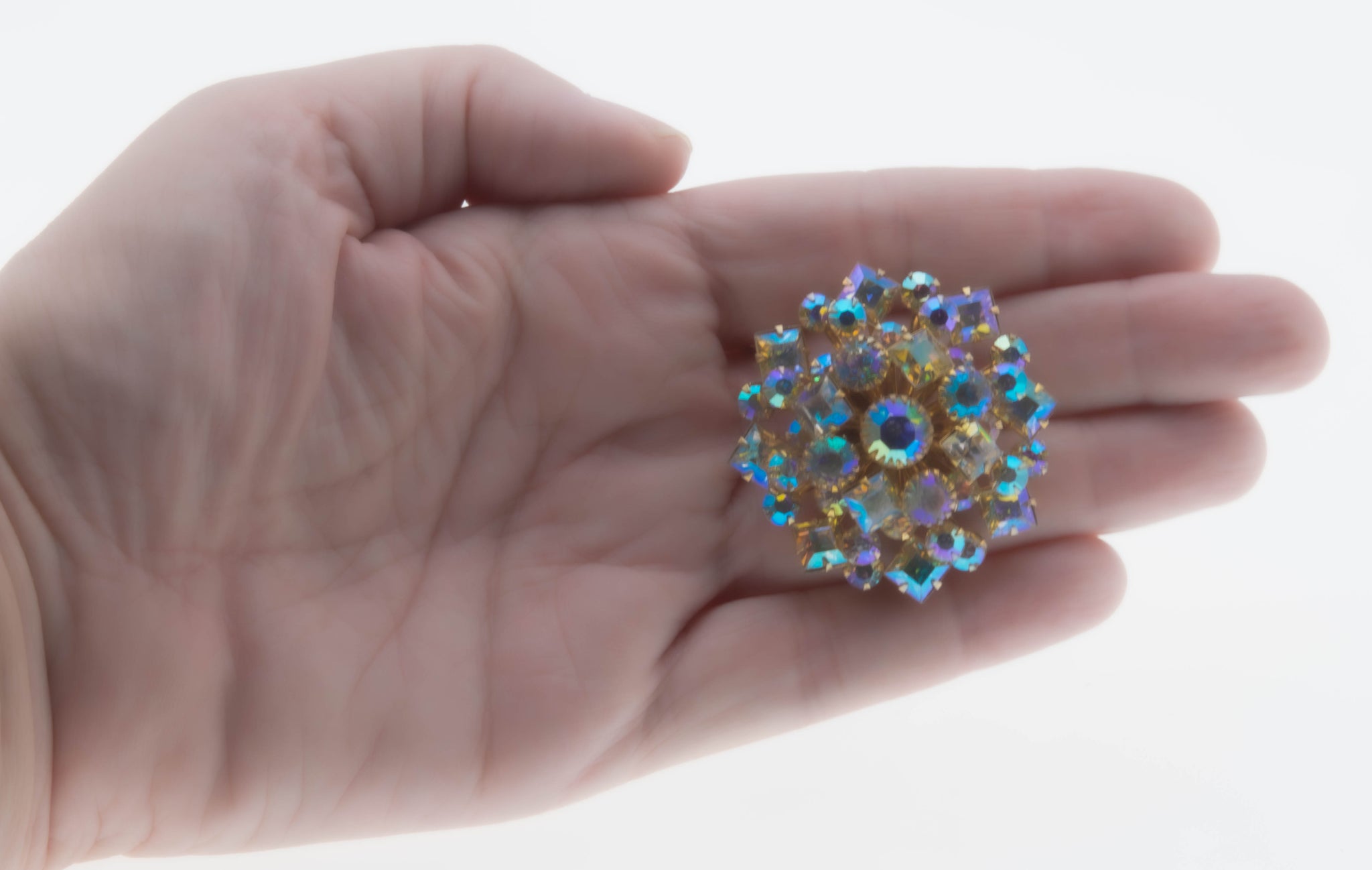 Glistening Snowflake - Vintage Signed 'TRIAD' Gold Plated Austrian Swarovski Aurora Borealis Crystal Rhinestone Brooch. This vintage brooch is crafted from gold plate over metal. The brooch features numerous square cut and round cut faceted Swarovski aurora borealis crystal rhinestones, vintage styling, and quality craftsmanship. The gallery on this gorgeous brooch is made in the form of a snowflake. The brooch showcase aurora borealis crystals, displaying a variation of colors in different light intensities, ranging from blue, green, pink and violet. The pin on the back securely locks into place, and is in perfect working order. The vintage brooch would make a perfect accessory to any outfit.